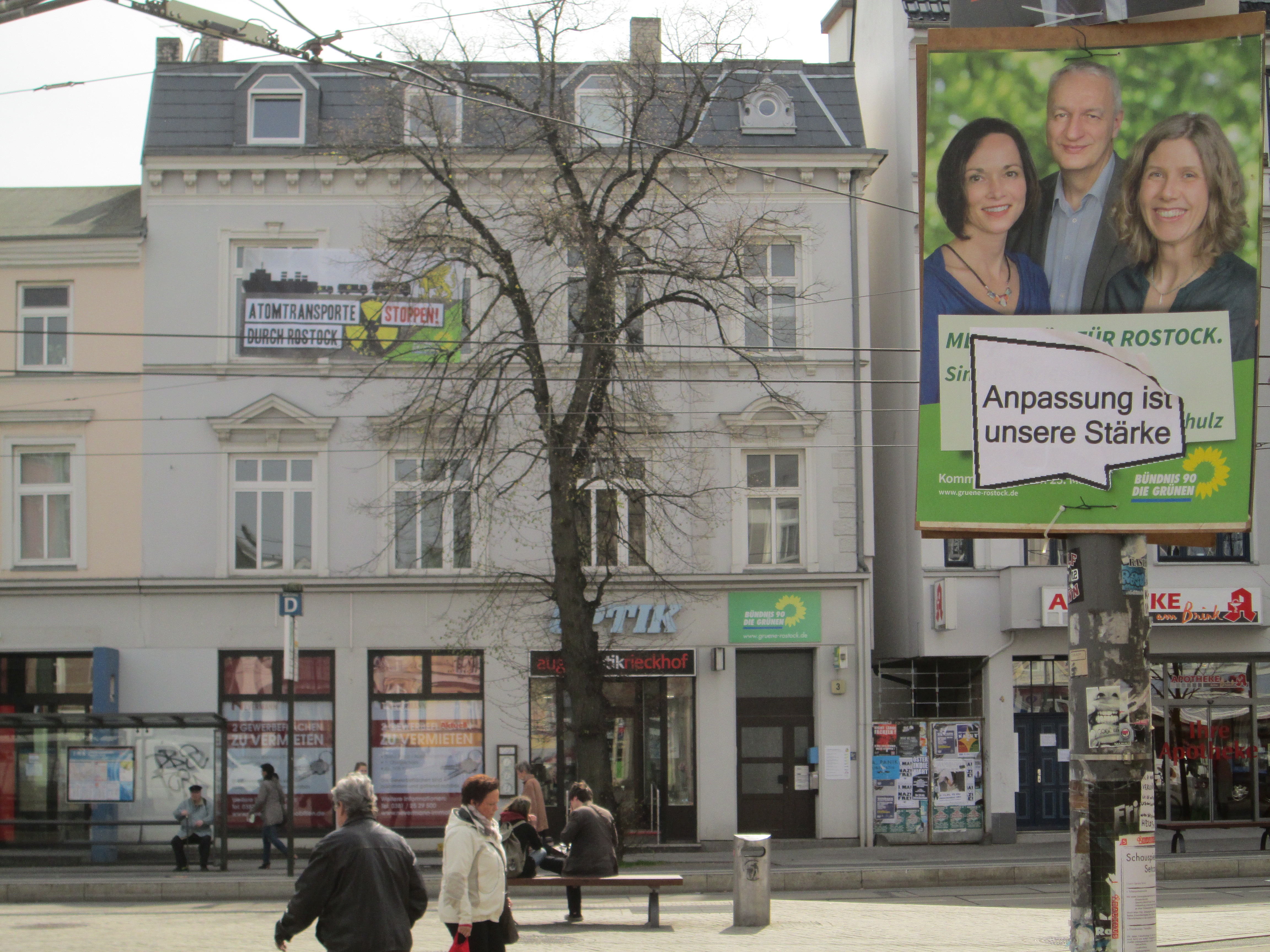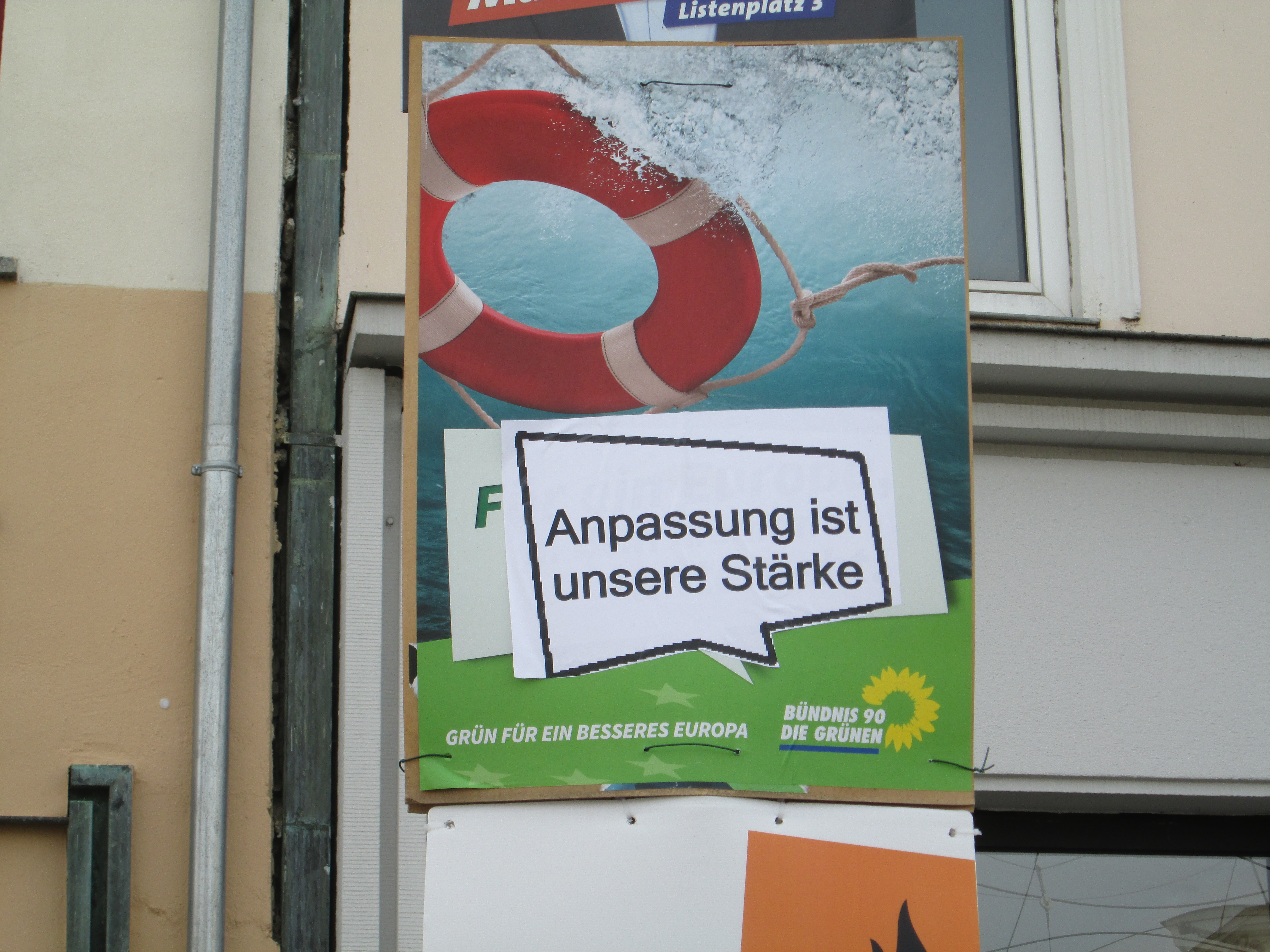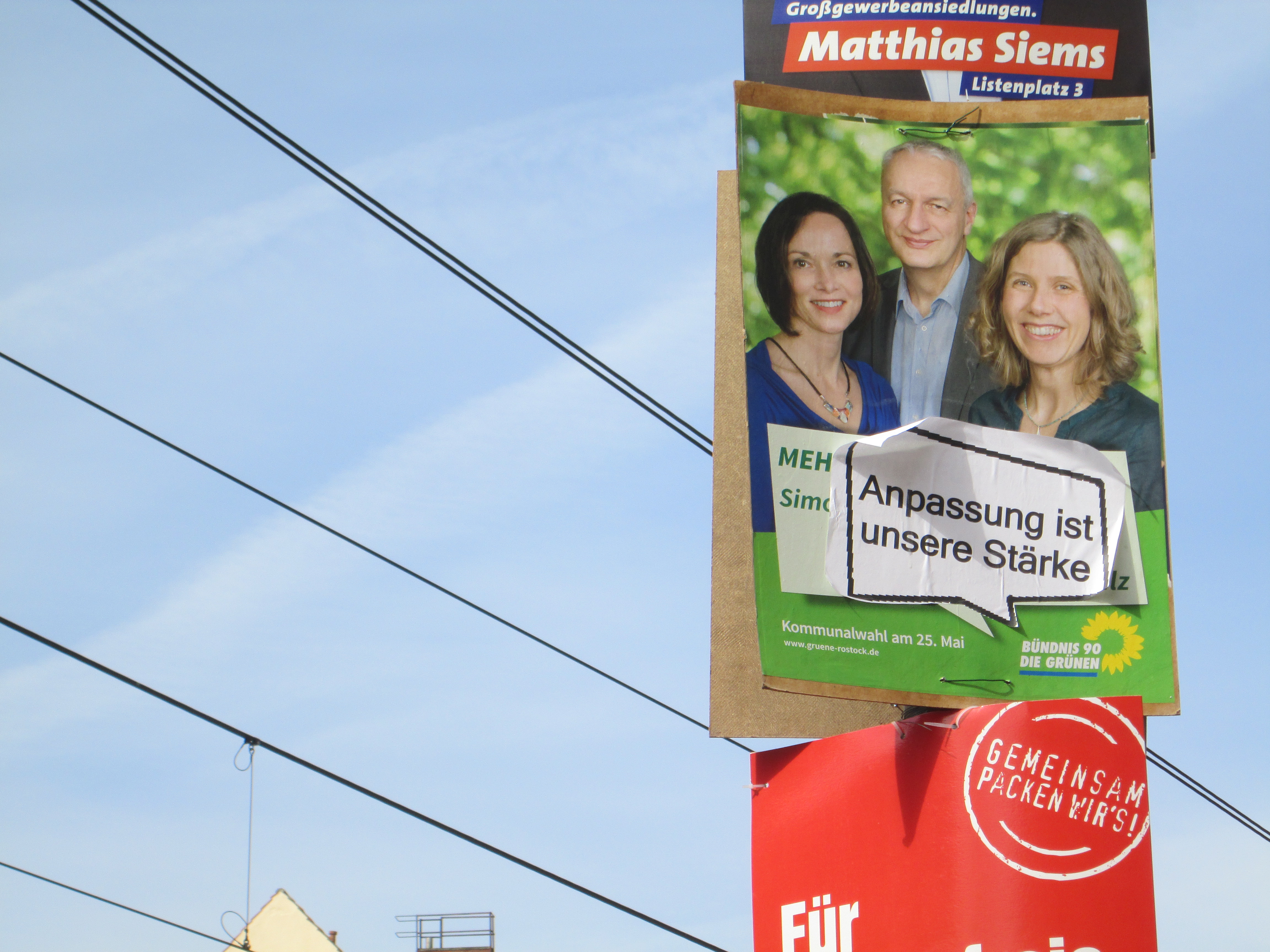HRO: „Anpassung ist unsere Stärke.“ Grüne Dissident_innen verbessern Wahlplakate der Grünen am Doberaner Platz In der Nacht vom 16.4.2014 auf den 17.4.2014 haben wir uns in Rostock in den Auftakt des laufenden Europawahlkampf eingemischt. Unser Ziel waren dabei die Wahlplakate der Grünen am Doberaner Platz. Mit dem Slogan „Anpassung ist unsere Stärke“ haben wir die Plakate rund um die Rostocker Kreisgeschäftsstelle ergänzt. Mit diesem Vorschlag zur Gestaltung ihrer Außendarstellung möchten wir unseren Parteifreund_innen nahe legen, sich auch bei unserer Werbung auf unsere Kernkompetenzen zu besinnen und dem Wählern und Wählerinnen ein realistisches Bild grüner Politik zu vermitteln.