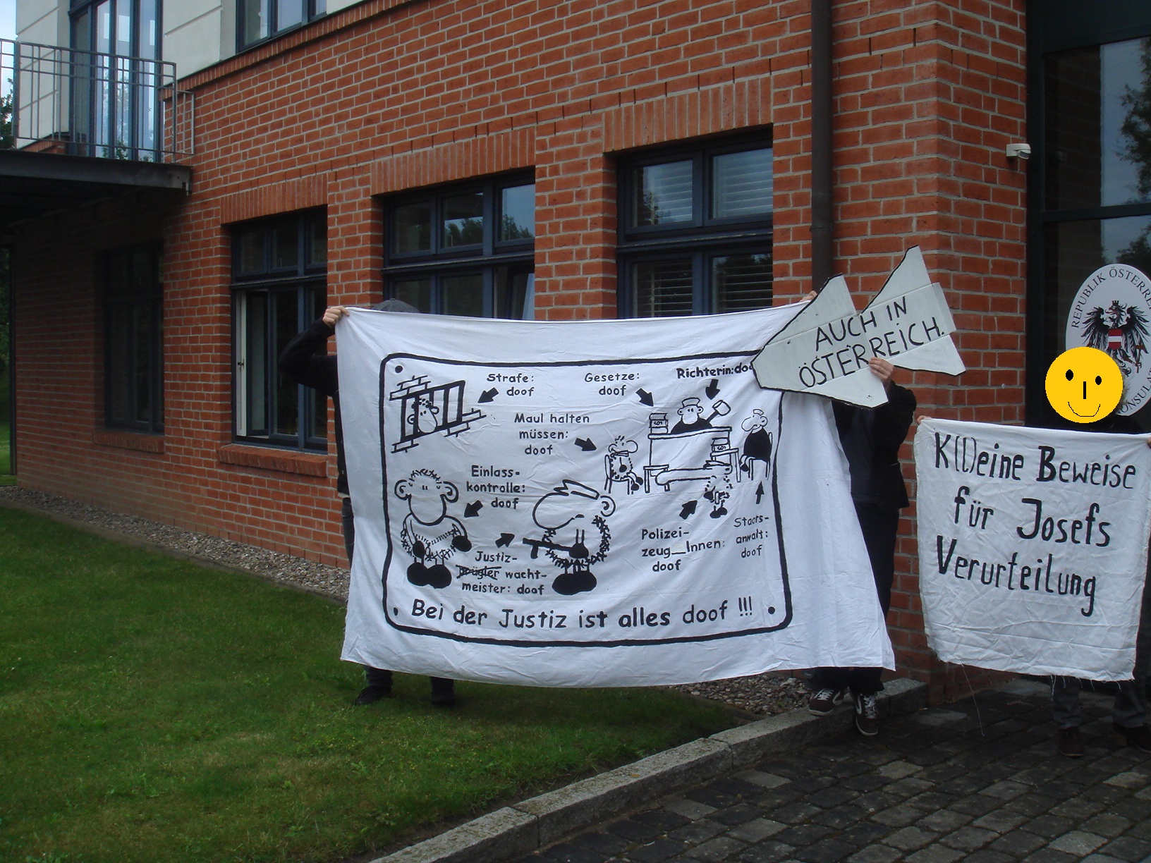 Die Aktionsgruppe forderte mit ihrem Protest die sofortige Freilassung und die Einstellung des Verfahrens gegen Josef. Denn ist der Prozess auch eine Farce, die Lage ist ernst: