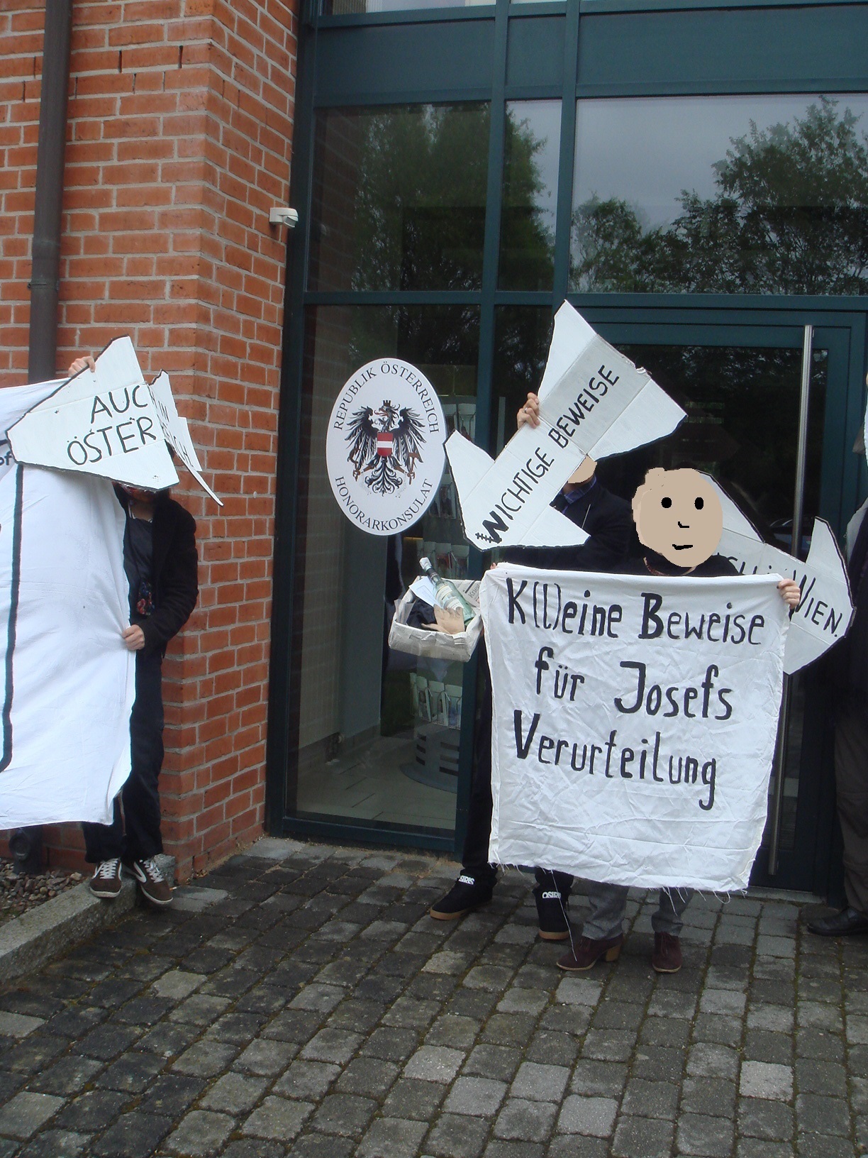 Mit der Aktion wollte sich die Rostocker Soligruppe „Free Josef“ sich Josef S. gegenüber solidarisch zeigen und die willkürliche Inhaftierung anprangern, sowie die Kriminalisierung antifaschistischer Proteste im Allgemeinen kritisieren. Um die politische Motivation des Verfahrens gegen Josef aufzuzeigen, sollte dem Honorarkonsul Wolfgang Grieger ( http://www.honorarkonsul.at/) ein Präsentkorb voller lächerlicher Beweise überreicht werden. Der Korb enthielt hübsch aufgemacht vermeintliche Beweisstücke, die in ihrer Qualität und Aussagekraft denen der Wiener Staatsanwaltschaft im Verfahren gegen Josef ähneln: Eine leere Flasche Wein, Streichhölzer, ein dreckiger Handschuh, eine linke Zeitung und ein schwarzer Pullover. Leider war der Konsul nicht anwesend, um die Beweise in Empfang zu nehmen. Aber zumindest die Petition wurde durch eine Angestellte entgegen genommen.