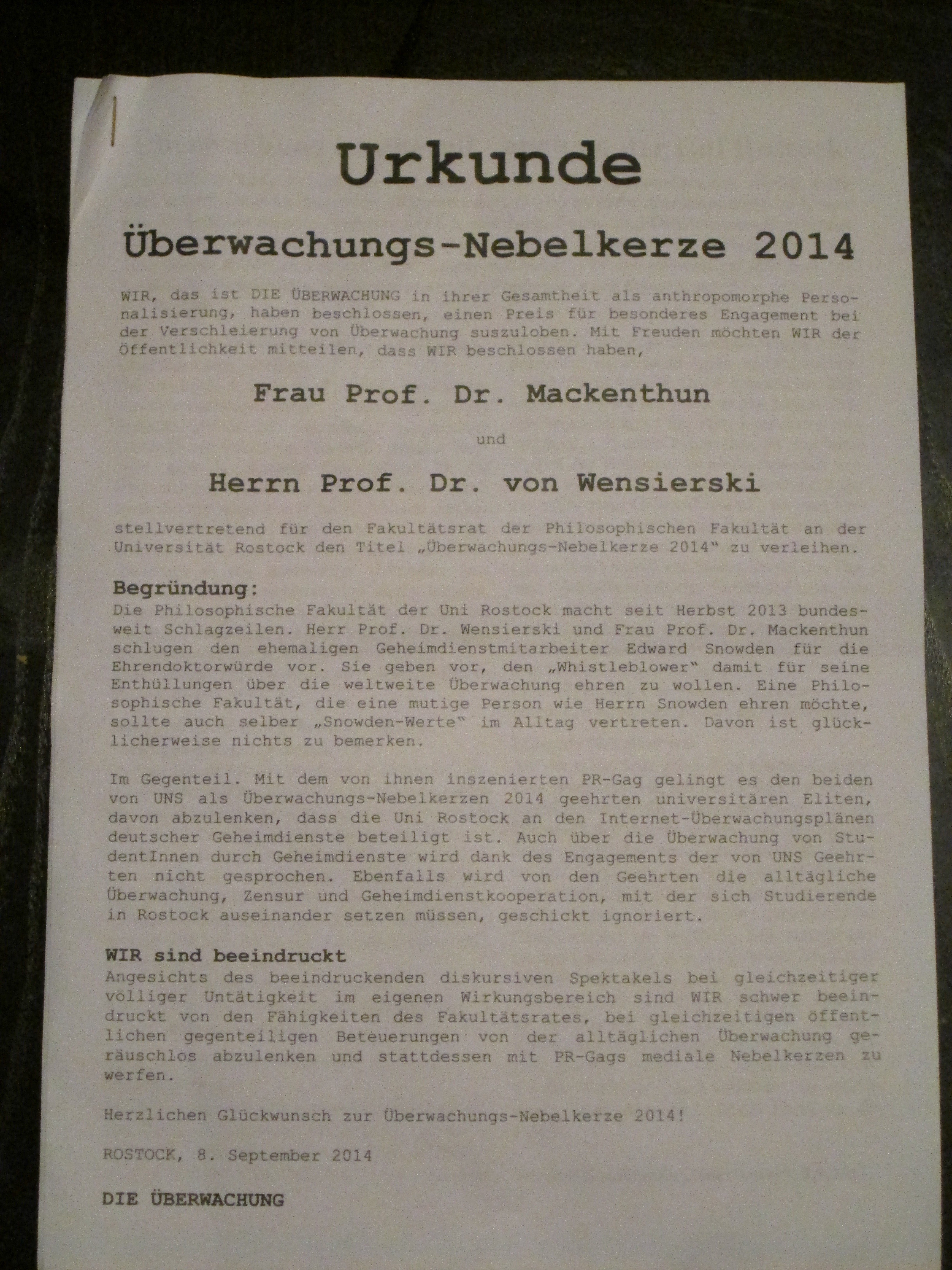 Mehr Infos zu Zensur und Überwachung an der Uni Rostock: http://kritischeunihro.blogsport.de/2014/ 01/19/ehrendoktor-fuer-edward-snowden-zensur-und-ueberwachung-an-der-uni-rostock/