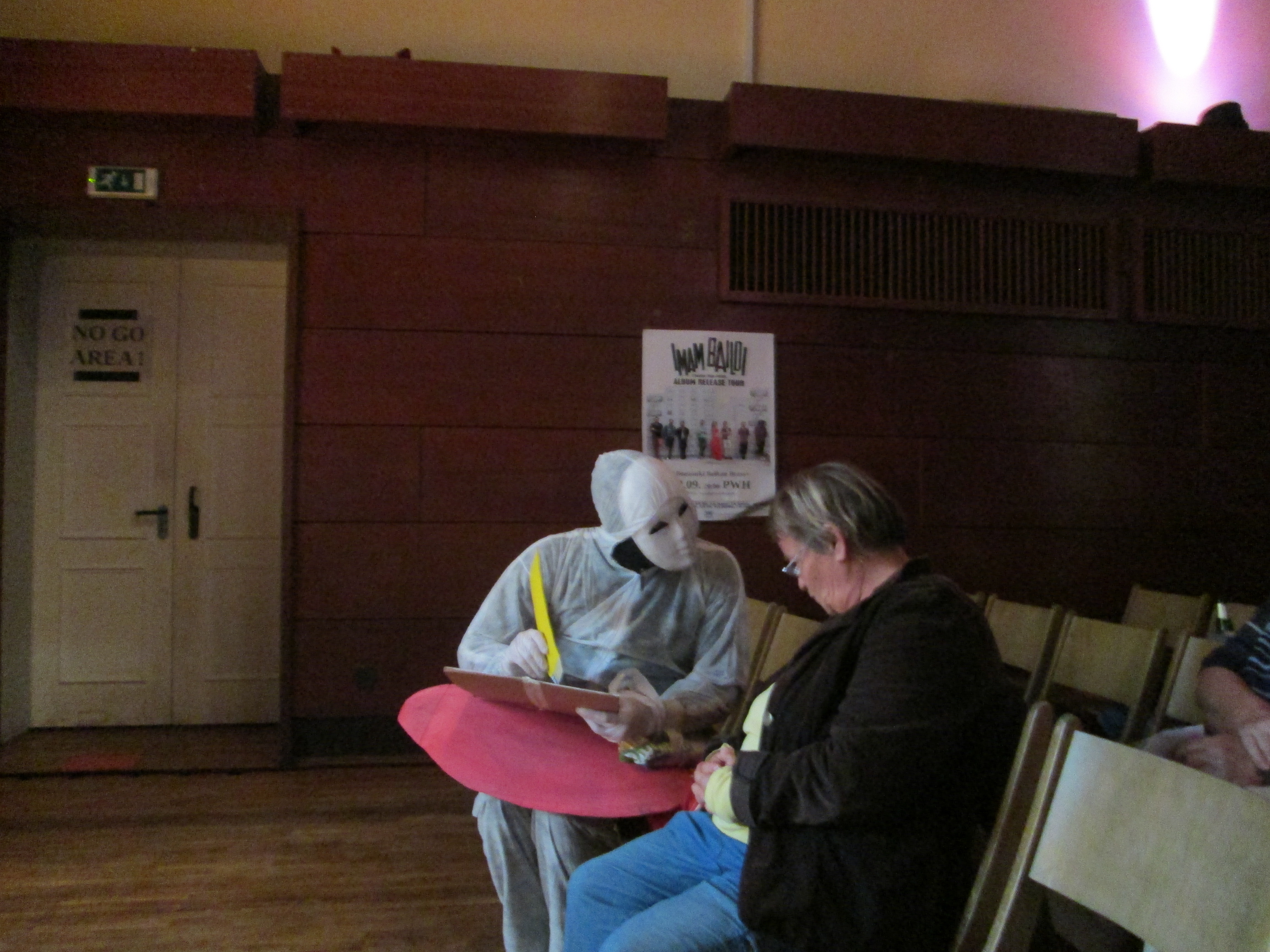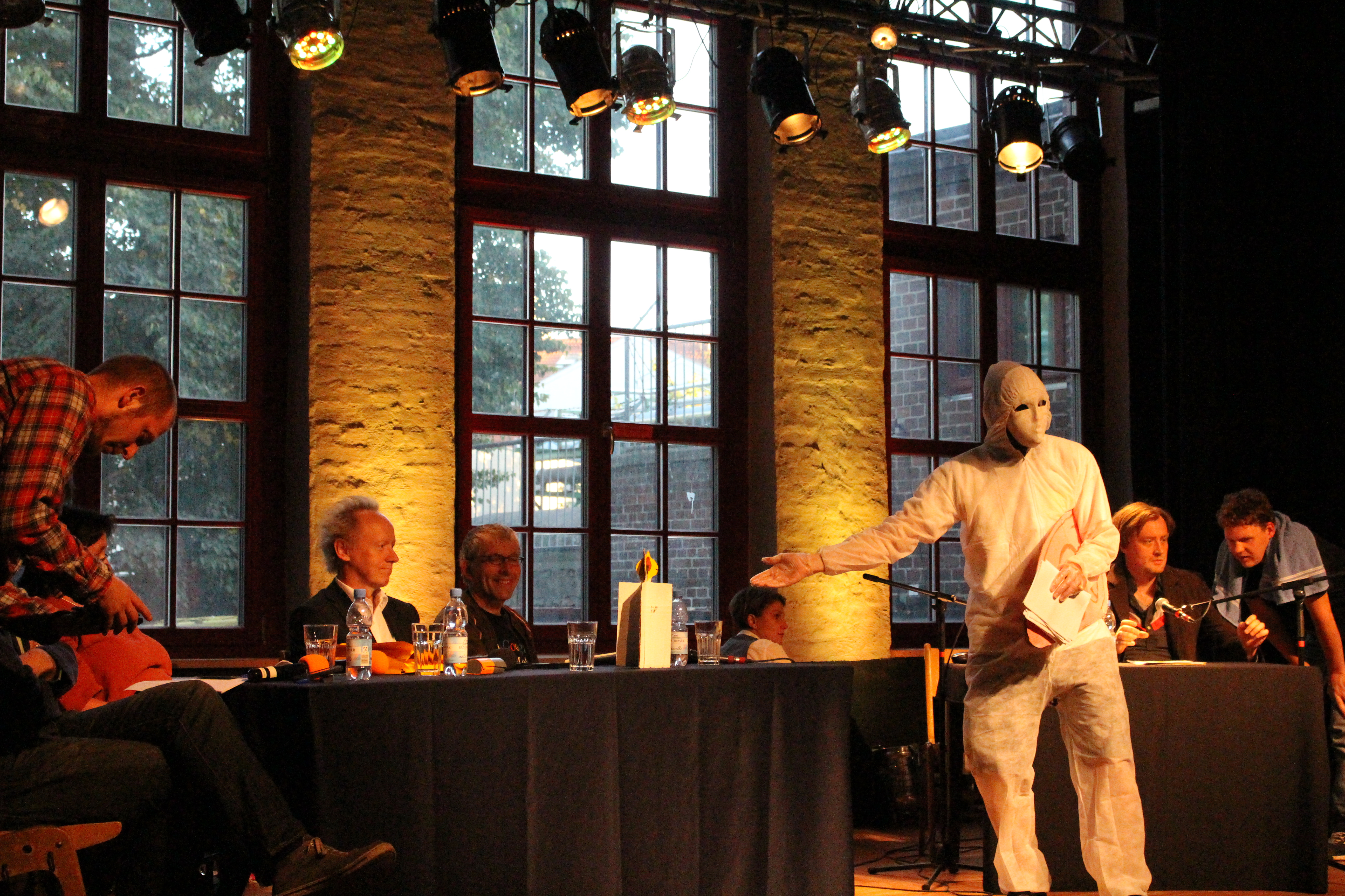 Den Beginn der Lesung begleitete die Gruppe in weisen Anzügen mit weisen Theatermasken als „antropromorphe Personalisierung“ der Überwachung. Mit überdimensionierten Ohren und Augen ausgestattet bespitzelten die als Überwachung in Person gestylten TeilnehmerInnen das Publikum. Außerdem überreichten die Verkleideten den beiden Profs die „Überwachungs-Nebelkerze 2014“ und verteilten entsprechende Ehrenurkunden. Auf diesem erklärte die Theatergruppe auch ihr Anliegen.