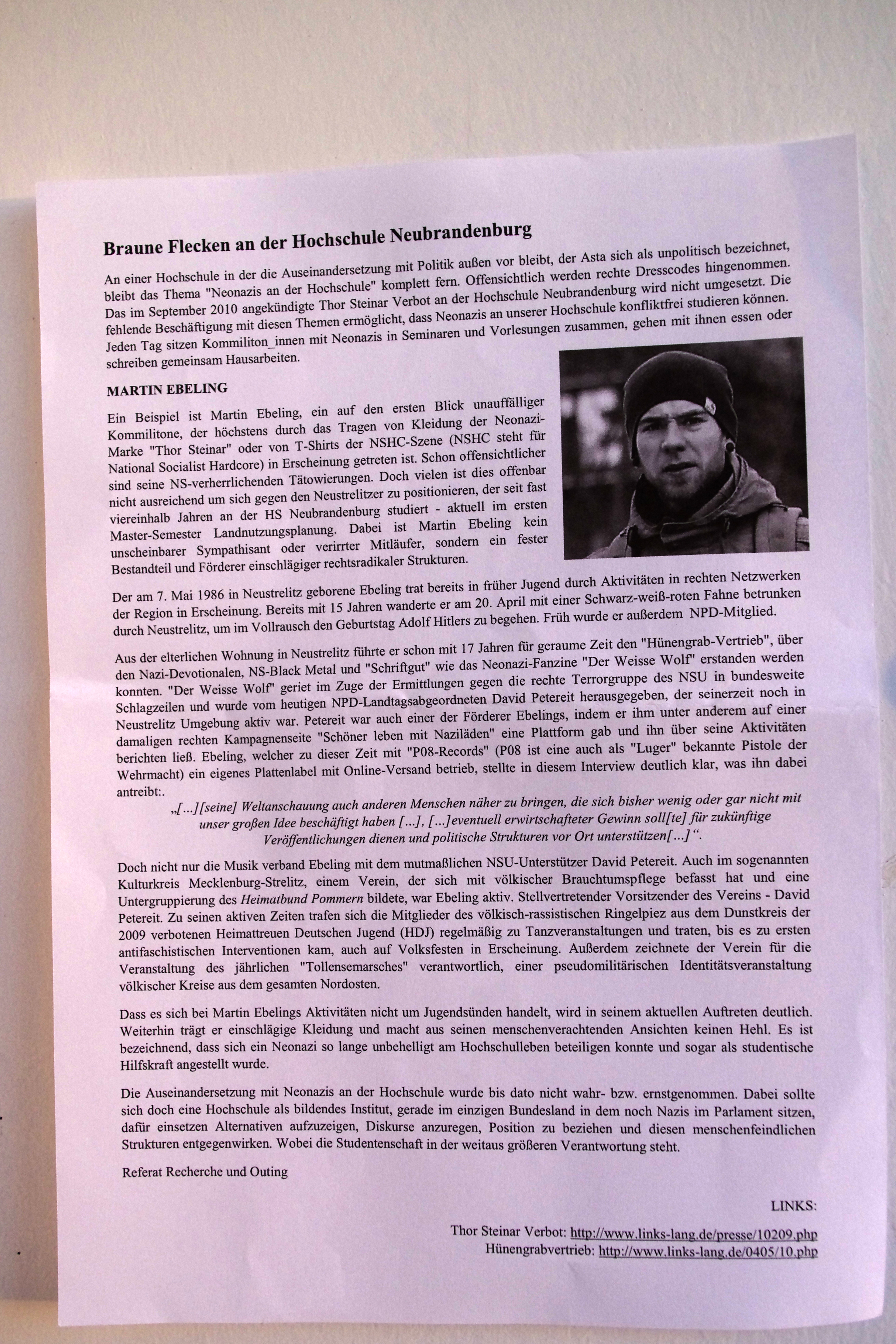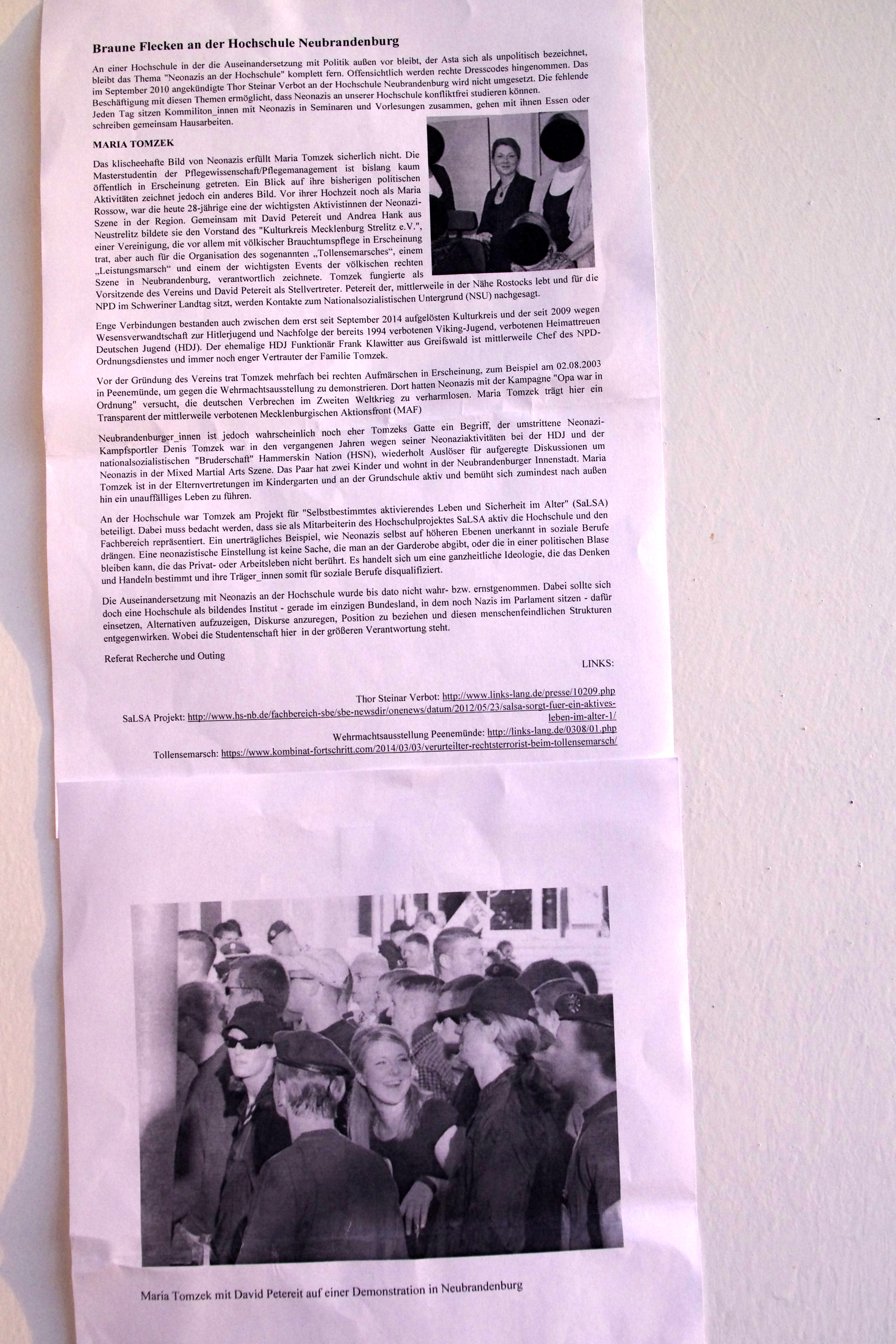 Gegenwärtig sorgen 2, an der Hochschule in Neubrandenburg verteilte, Flugblätter für Aufregung. Auf diesen werden 2 lokale Neonazi-Kader aus der Region Neubrandenburg/Neustrelitz geoutet. Es handelt sich dabei um den 28 Jahre alten Martin Ebeling und die ebenfalls 28ährige Maria Tomzek (geb. Rossow). Beide waren in der völkisch-rassistischen ausgerichteten Vereinigung „Kulturkreis Mecklenburg-Strelitz“ aktiv, der auch der NPD Landtagsabgeordnete, und mutmaßlichen Unterstützer des NSU, David Petereit angehörte.
