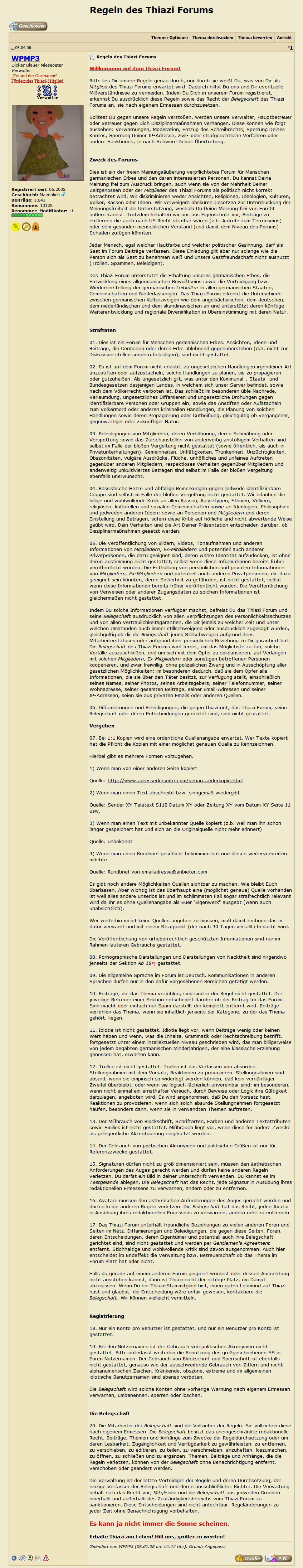 Überraschend sind Relativierungen dieser und ähnlicher Art jedoch nicht. Nach dem nunmehr 11. Verhandlungstag im «Thiazi»-Prozess lassen sich bestimmte Muster in den Aussagen der Beschuldigten und Beteiligten erkennen, die am besten mit „von nichts gewusst“ und „nicht über die Bedeutung nachgedacht“ beschrieben werden können. So führten beispielsweise Wagner, Eberhardt und Rohde aus, dass sie vom Forum „nicht haben loslassen“ können, die Tragweite ihres Tuns hätten sie zudem nicht erkannt, heute würden sie ganz anders handeln, hätten sie noch einmal die Wahl. Einhellig sagten sie aber auch aus, dass sie sich kaum an rassistische, volksverhetzende oder ähnliche Inhalte erinnern könnten, vielmehr sei das Forum einfach ein „Ort des freien Meinungsaustausches“ gewesen, ganz unverfänglich, ganz harmlos. Kritische Bereiche hätten sie wohl einfach „ausgeblendet“. Diese angebliche Ahnungslosigkeit und Erinnerungsschwäche wirkt auch ohne weitere Ausführungen wenig überzeugend. Vollkommen unglaubwürdig werden sie durch die wortgleichen Antworten Eberhardts und Rohdes auf die Frage des Richters, welche Regeln im Forum [[1]](https://linksunten.indymedia.org/image/137953.jpg) gegolten hätten: „Idiotie“ sei beispielsweise verboten gewesen, ein Begriff, der in Forenkontexten nicht alltäglich ist. Tatsächlich gab es in den offiziellen «Thiazi»-Regeln einen entsprechenden Eintrag, allerdings nicht an „prominenter“ Stelle. An Details können sich beide offenbar gut erinnern, das große ganze jedoch scheint ihnen abhanden gekommen zu sein.