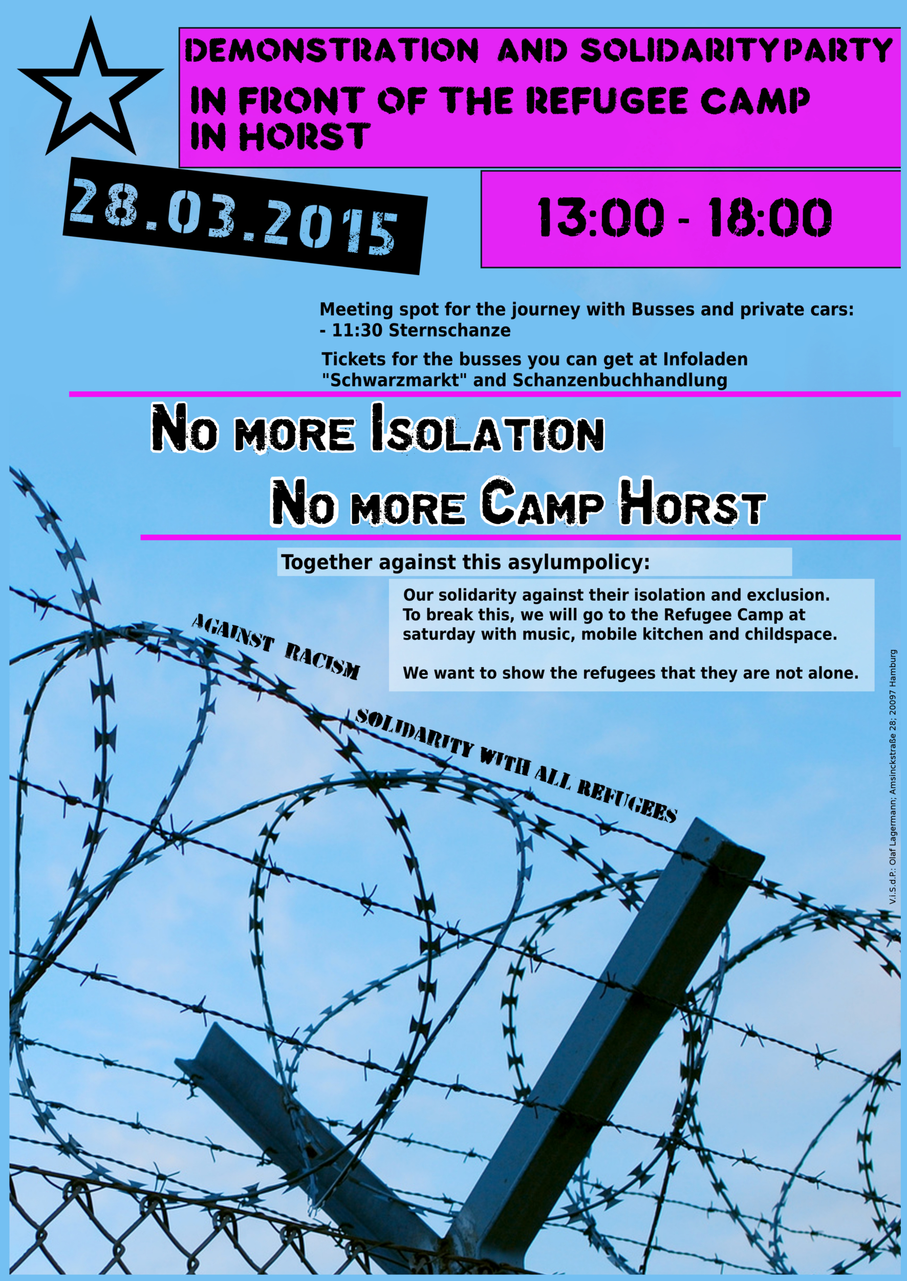 Im Lager in Horst zu leben, bedeutet für betroffenen Flüchtlinge systematisch entmündigt und erniedrigt zu werden. In Horst findet ganz offensichtlich politisch gewollte Isolation, Ausgrenzung und Diskriminierung von Flüchtlingen statt. Und Horst ist dabei kein Einzelfall! So werden Flüchtlinge auch in Hamburg in abgelegenen Gegenden wie dem Erstaufnahmelager auf dem Parkplatz der Imtech-Arena am Volkspark unter menschenunwürdigen Verhältnissen untergebracht. Während Familien sich mit fünf Mitgliedern winzige Container teilen müssen, sprechen die Verantwortlichen von einer “so angenehm wie möglichen” Situation.
