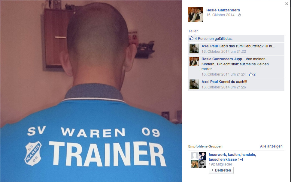 In seiner Position als Trainer beim SV Waren 09 trainiert er Jugendliche im Fußball, hat einen nicht unerheblichen Einfluss auf deren Entwicklung und deren zukünftige politische sowie soziale Verortung. Auf seinem Facebookprofil ( https://www.facebook.com/resie.ganzanders ) sind unter anderem auch Fotos von Kleidungsstücken zu finden, die ganz klar der rechten Szene zugeordnet werden können.