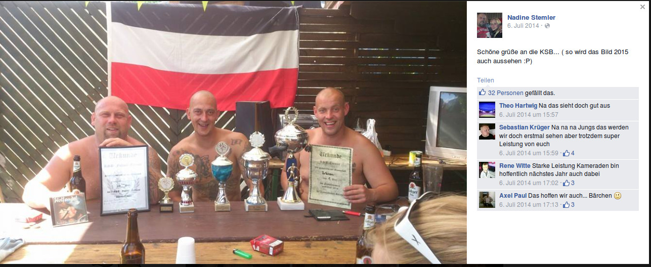 Die politische Ausrichtung von Rene Domröse und seinen Freunden, macht keinesfalls vor dem Sport halt. So präsentiert Rene Domröse zusammen mit seinen Kameraden diverse Fußballpokale und Urkunden vor einer Kaiserreichsfahne. Außerdem auf dem Foto zu sehen: eine CD der Neonazi Band “Wolfsrudel” mit dem Albumtitel “Freiheit für das deutsche Land”. Die Tonträger der Band Wolfsrudel wurden zum Teil von der Bundesprüfstelle für jugendgefährdende Medien indiziert.