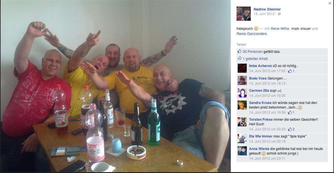 Damit aber noch nicht genug! Auf einem der Bilder die zum Teil von seiner eigenen Facebookseite aber auch von denen seiner Freunde stammen, posiert er mit dem Hitlergruß. Rene Domröse trägt auf dem Foto ein Shirt mit der Aufschrift Crew 38. Es handelt sich bei der Crew 38 um eine interne Unterstützergruppe der Hammerskins.