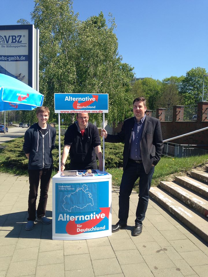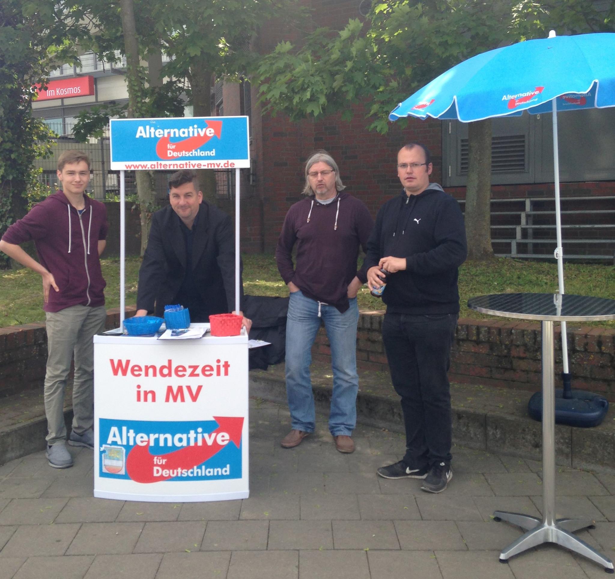 Seit einiger Zeit hat die AFD Ortsgruppe Rostock mit ihrem Vorsitzenden Holger Arppe wieder begonnen Wahlkampfstände in Rostock durchzuführen. Fast Wöchentlich versuchen Sie mit diesen Ständen ihre rassistische Hetze zu verbreiten und Wähler zu Gewinnen. Allerdings nur mit sehr wenig Erfolg, meistens stehen sie Stundenlang mit genervten Gesichtern alleine rum. Zuletzt fanden die Infostände am Neuen Markt, Uni Platz, Marktkauf Lütten Klein und dem Südstadtcenter statt.