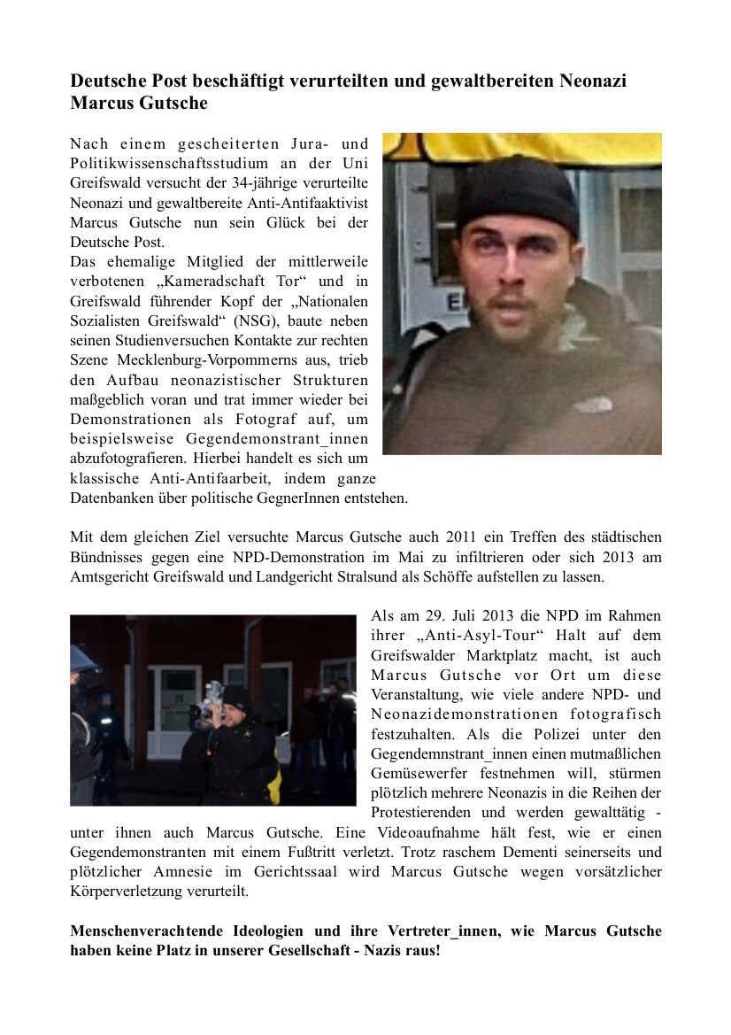 Nach einem gescheiterten Jura- und Politikwissenschaftsstudium an der Universität Greifswald versucht der 34-jährige verurteilte Neonazi und gewaltbereite Anti-Antifaaktivist Marcus Gutsche nun sein Glück bei der Deutschen Post.