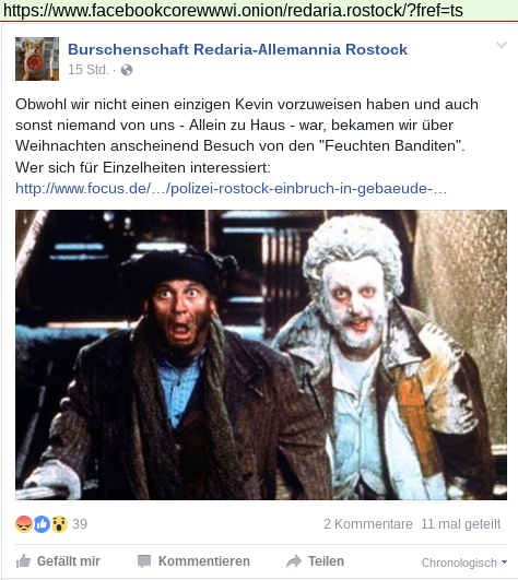 Über die Weihnachtsfeiertage durfte sich die extrem rechte Rostocker Burschenschaft Redaria Allemannia über einen Hausbesuch der besonderen Art freuen. Wie sowohl der Polizeipresse, als auch dem Facebookprofil der Burschenschaft zu entnehmen ist, drangen über die Weihnachtsfeiertage couragierte Menschen in das Haus ein.