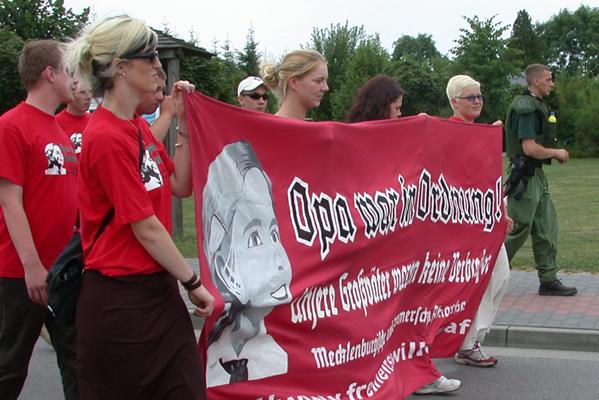 Im Gegensatz zu ihrer aktuellen „Unauffälligkeit“ trat Tomzek vor der Gründung des Kulturkreis wiederkehrend bei rechten Aufmärschen in Erscheinung. So demonstrierte sie z. B. 2003 in Peenemünde (Foto) gegen die vielbeachtete Wehrmachtssaustellung und trug das Fronttransparent der ebenfalls verbotenen Mecklenburgischen Aktionsfront (MAF) im Rahmen der Kampagne „Opa war in Ordnung“, mit der Neonazis versuchten die deutschen Verbrechen im Zweiten Weltkrieg zu verharmlosen. Im Jahr 2007 nahm sie außerdem selbst am von David Petereit maßgeblich organisierten “Leistungsmarsch” um den Tollensesee teil und versuchte 2004 in Neubrandenburg -auch wieder zusammen mit David Petereit- eine Demonstration gegen Harz 4 zu unterwandern (Foto).