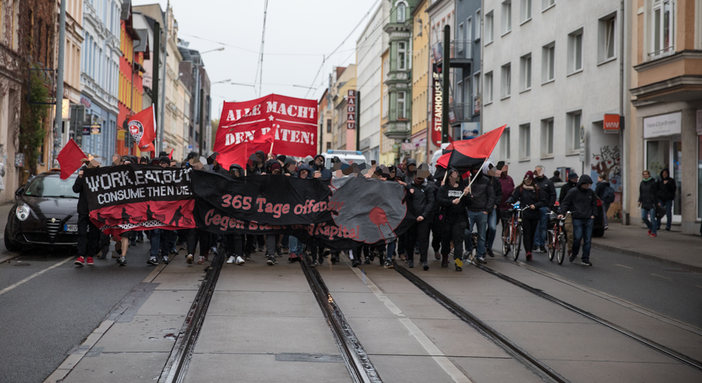 Gegen 17 Uhr sammelten sich etwa 100 Menschen bei schlechten Witterungsbedingungen, um unter dem Motto „365 Tage im Jahr gegen Staat und Kapital!“ zu demonstrieren. Als Auftaktort diente der Doberaner Platz von dem aus bereits am 1. Mai eine Demonstration der DGB Jugend startete. Diese versuchten etwa 15 Neonazis am Montag zu stören, indem sie per Transparent die Inhaftierung von Gewerkschaftern 1933 feierten. Antifas schritten ein und konnten verhindern, dass die Neonazis hinter der Gewerkschaftsdemo herliefen. Dies hatte die Polizei den Rechten zuvor skandalöser Weise angeboten. Nach vehementem Entgegentreten, flohen die Neonazis jedoch in die Straßenbahn. Die Polizei nahm einen Antifaschisten fest.