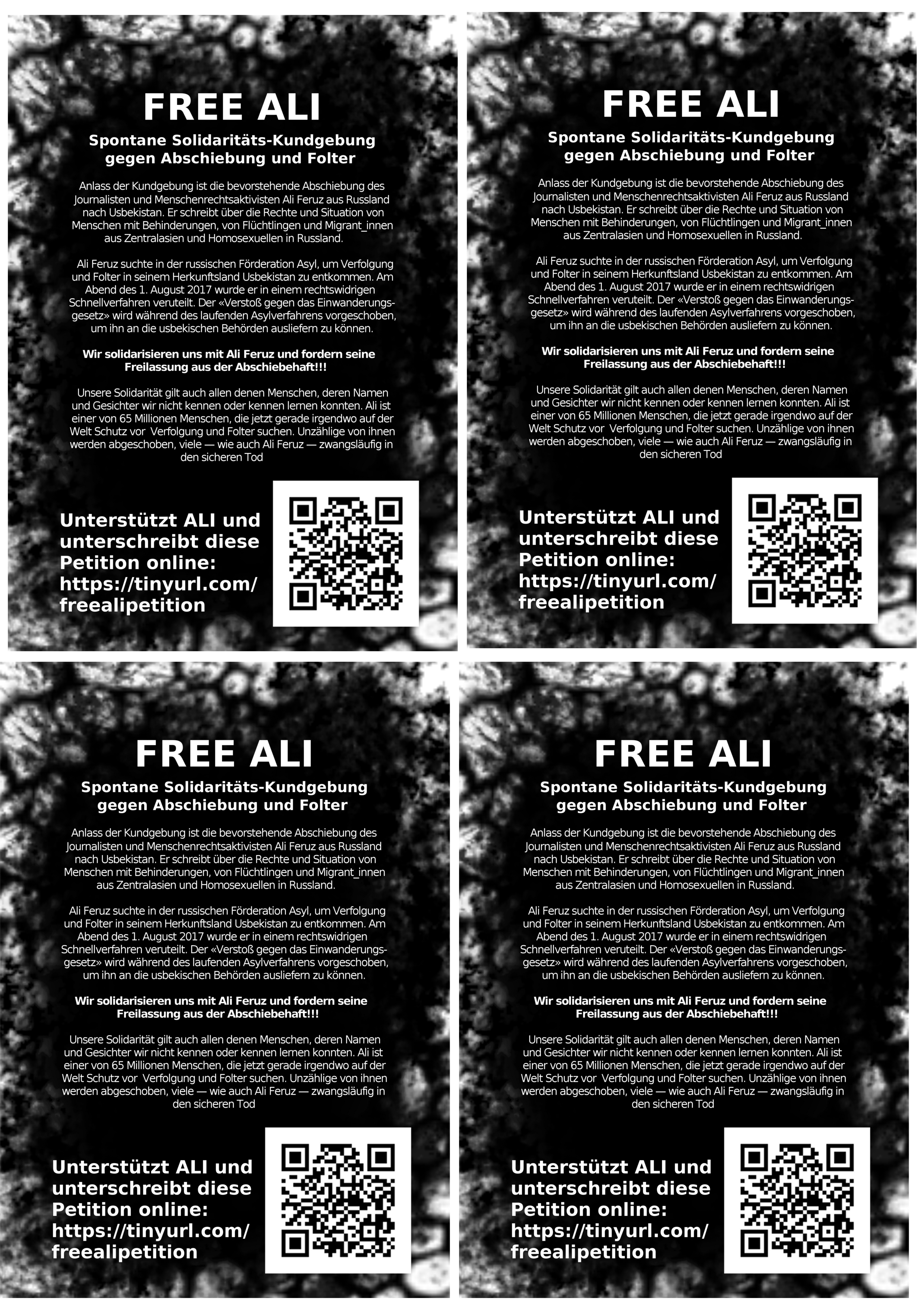 Ali Feruz, unserem Freund und Gefährten, droht nach der Abschiebung der sichere Tod im Knast in Usbekistan. Ali wird als „Terrorist“ in Usbekistan gesucht. Außerdem lebt er offen schwul. Beides klare Haftgründe in seinem Herkunftsland. Beides Todesurteile im Knast. Mit dem „Terrorismus“-Vorwurf kriminalisieren die usbekischen Behörden Ali ohne irgendwelche Beweise zu haben. Es geht schlichtweg darum, diplomatischen Druck auf Russland aufzubauen, ihn nach Usbekistan zu bringen.
