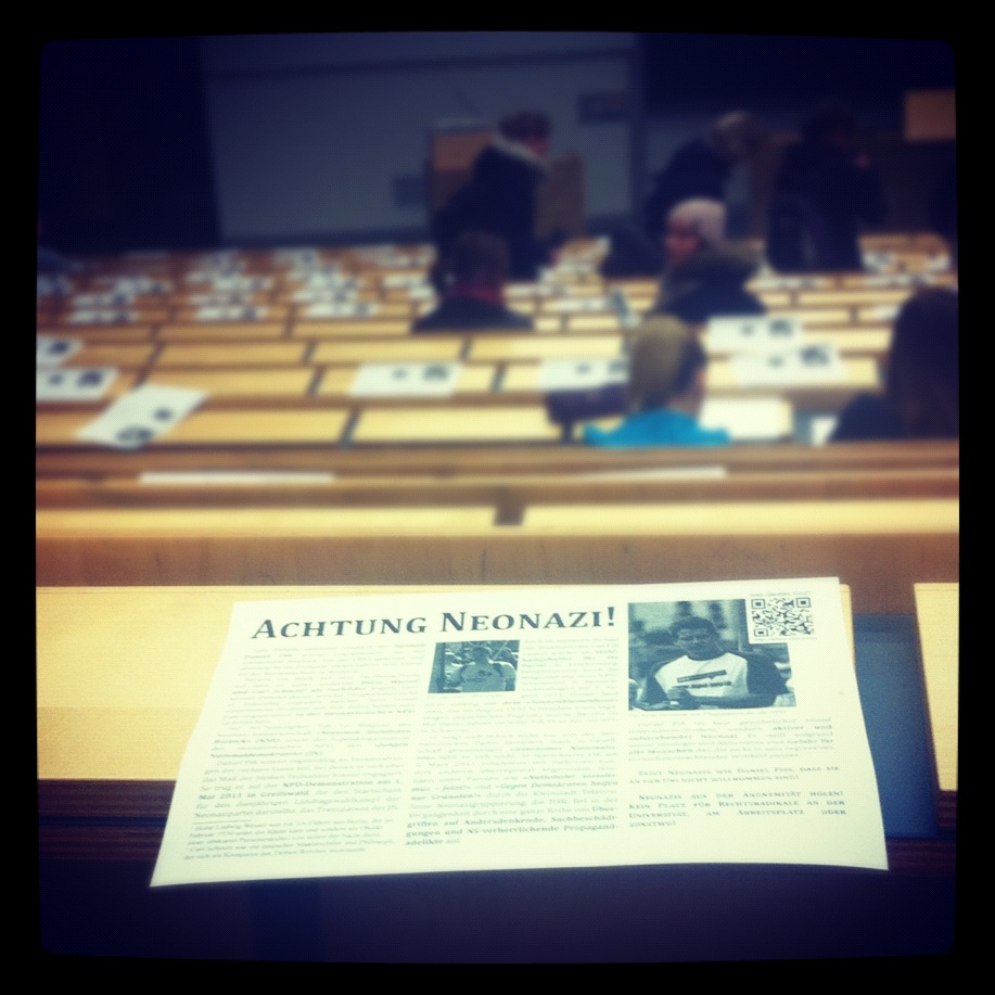 Der Tag begann denkbar unerfreulich für den Rostocker Neonazi Daniel Fiß: heute morgen outeten ihn Antifaschist_Innen an der hiesigen Universität und verteilten in diesem Zuge mehrere hundert Flugblätter und Plakate.