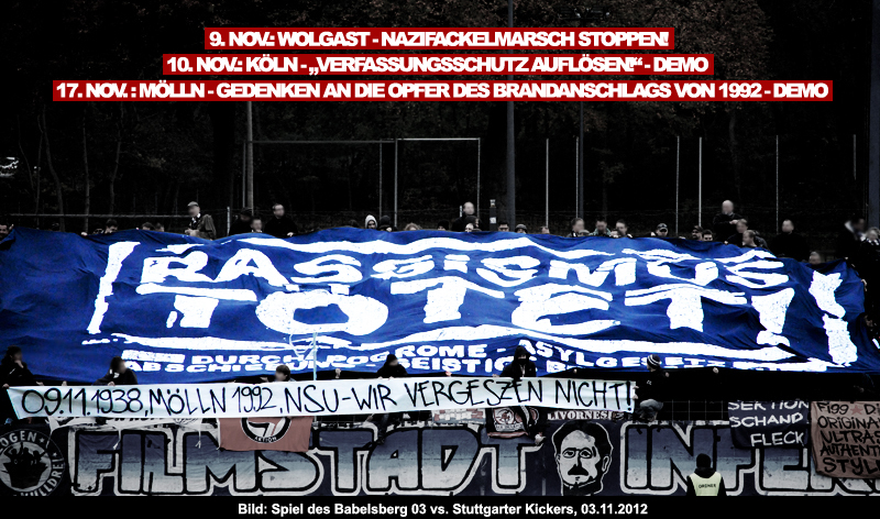 Während des Spiels Babelberg 03 vs Stuttgarter Kickers am 3.11.2012 haben wir eine Soli-Banner-Aktion gegen den rassistischen Normalbetrieb durchgezogen. Wir solidarisieren uns mit den Protesten gegen den Neonazi-Fackelmarsch am 9. November in Wolgast, der sich gegen die BewohnerInnen eines neuen Flüchtlingsheims richtet. Außerdem wollen wir dazu aufrufen am 10. November nach Köln und am 17. November nach Mölln zu fahren.