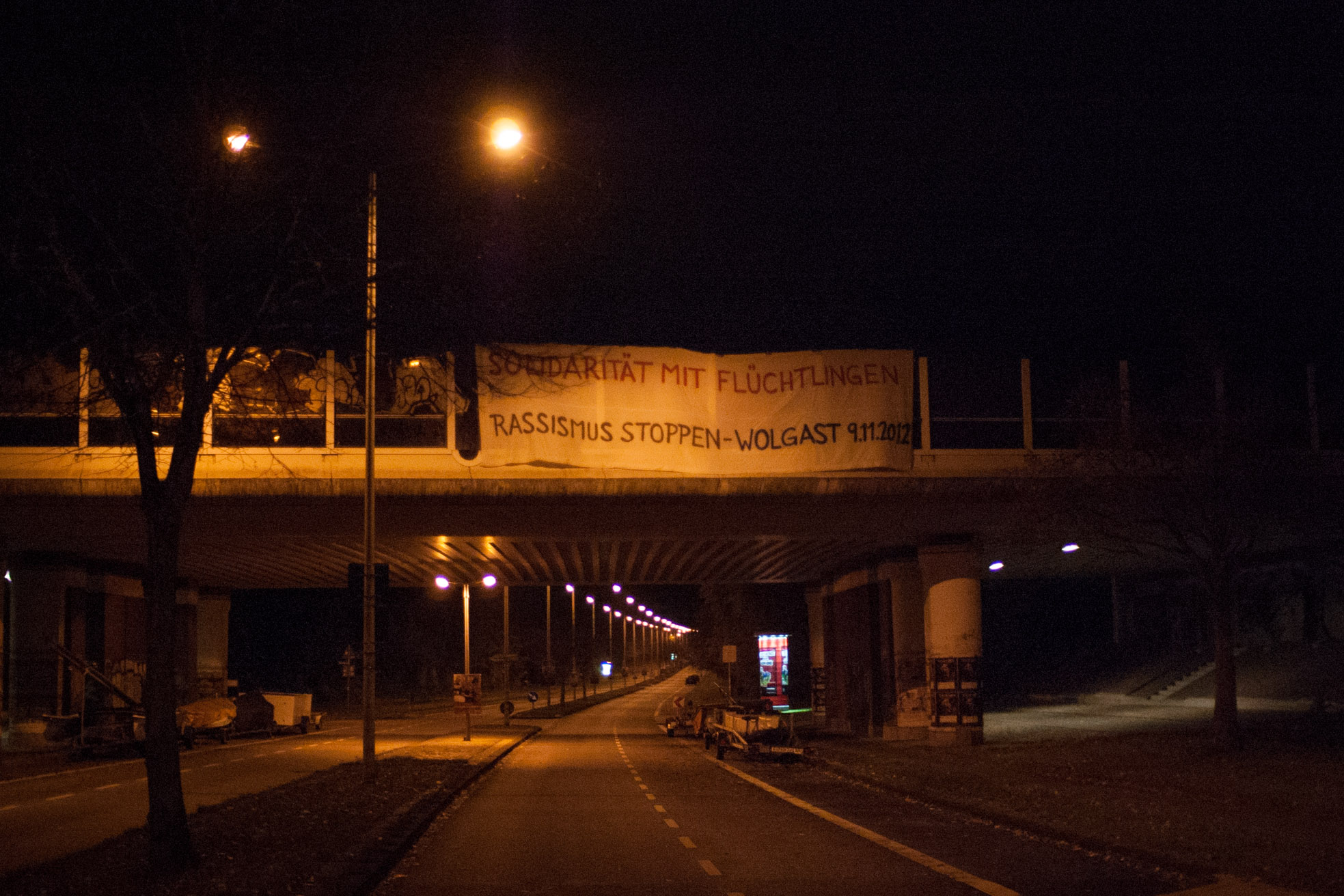 Vor drei Monaten wurde das Wohnheim in Wolgast in Betrieb genommen, in dem mittlerweile etwa 160 Geflüchtete untergebracht sind. Isoliert in der vorpommerschen Provinz, waren sie von Anfang an den rassistischen Ressentiments einer deutschen Kleinstadt hilflos ausgeliefert. Für die aktiven Neonazis der Region bieten diese Vorurteile zusammen mit dem Wohnheim als konkrete Projektionsfläche eine willkommene Gelegenheit, um ihre menschenverachtende Propaganda zu verbreiten. Und so verwundert es nicht, dass das Gebäude bereits mehrfach angegriffen wurde.