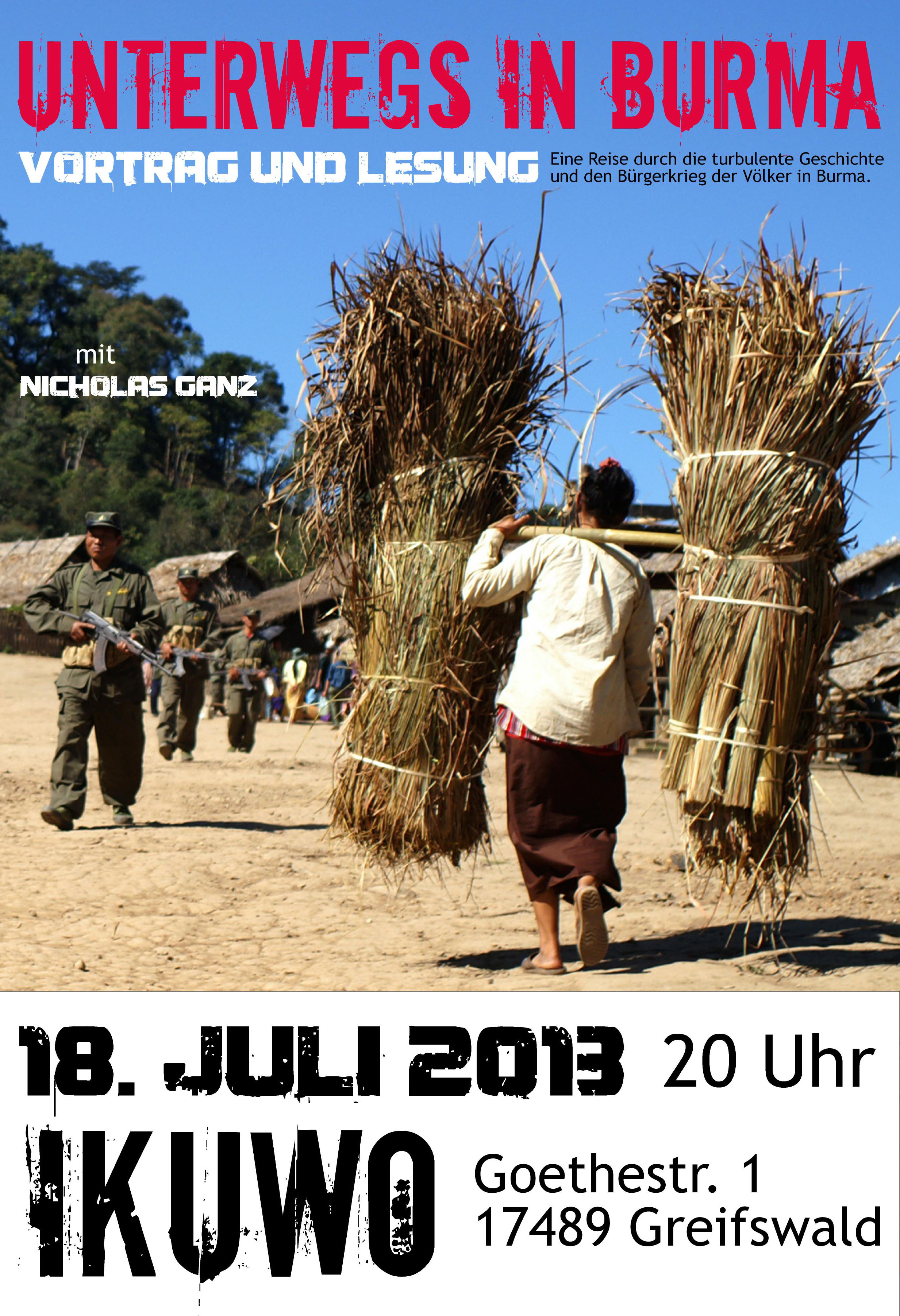 Burma (oder Myanmar, Birma) ist eines der ärmsten Länder Südostasiens und war bis 2010 die am längsten andauernde Militärdiktatur der Welt. Seitdem befindet sich Burma zwar in einem politischen Umbruch, jedoch hat sich die Situation für viele Menschen leider kaum verändert. Der Fotograf und Autor Nicholas Ganz liest aus seinem Buch “Unterwegs in Burma - Eine Reise zum Volk der Shan” und informiert anhand der Geschichte und Situation des Shan Volkes über die Auswirkungen von fast 60 Jahren Diktatur sowie rassistischer Unterdrückung und gibt einen Einblick in die derzeitigen Veränderungen des Landes.
