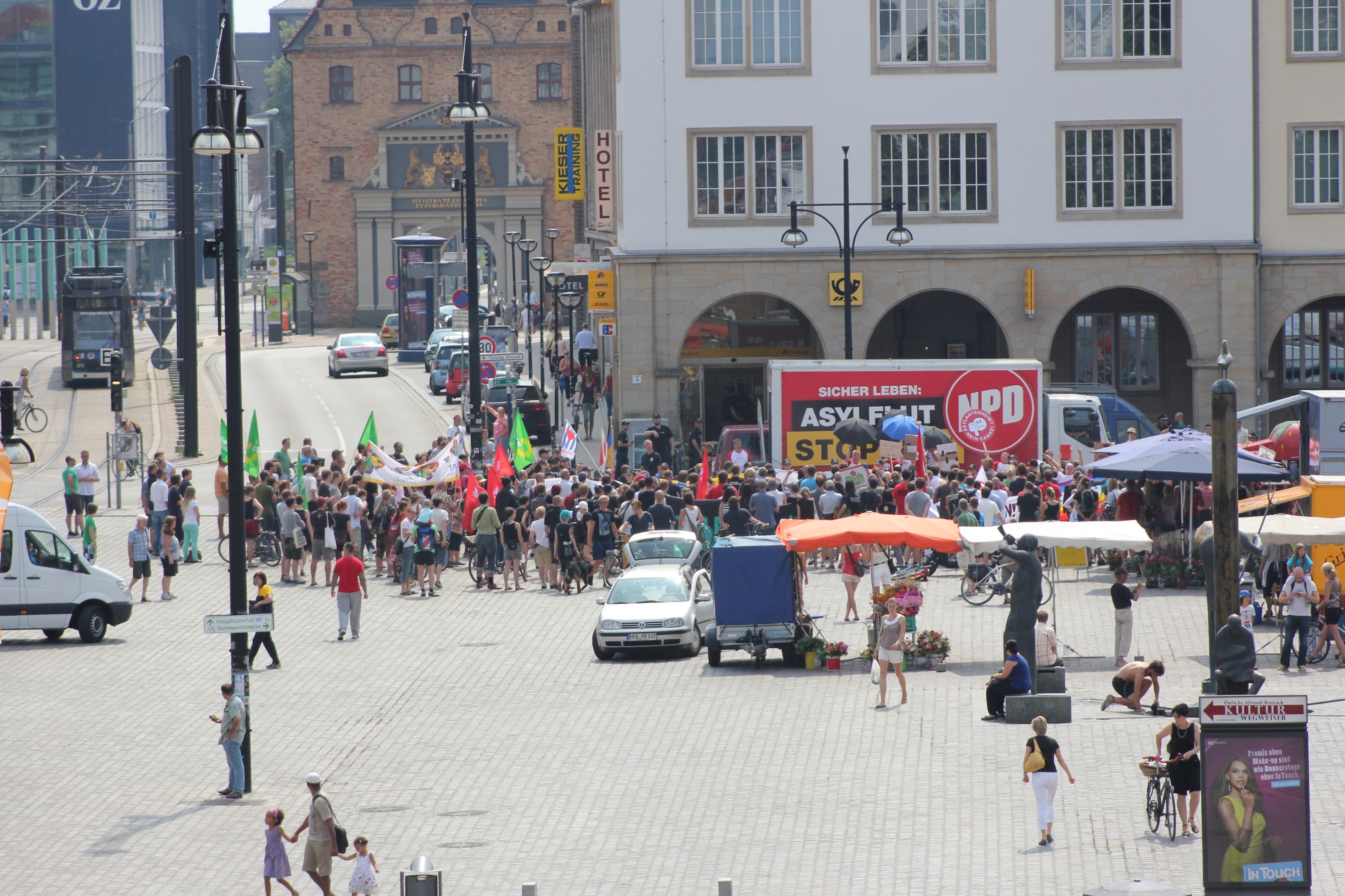 Gegenwärtig tourt die NPD im Rahmen des Bundestagswahlkampfes durch Mecklenburg-Vorpommerns Städte und hetzt gegen Asylbewerber_innen. Bisher fiel die Widerstand gegen die rassistische Propagandafahrt eher gering aus. Nachdem sich die NPD jedoch bereits am Mittwoch in Stralsund schon regen Protesten ausgesetzt sah, wurde ihr heutiger Tourstopp in Rostock gänzlich zum Debakel.