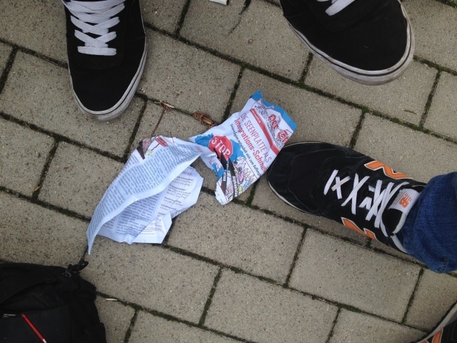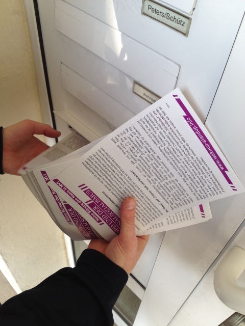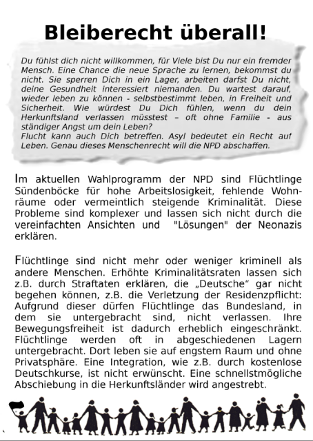 Seit Wochen zieren Wahlplakate mit volksverhetzenden Parolen die Straßen der Stadt, regelmäßig erreichten Flyer und Wahlzeitungen die Haushalte. Mit stumpfen Parolen, rassistischer Emotionalisierung komplexer Angelegenheiten wie des Asylrechts und verquerer Kapitalismuskritik versuchen die Neonazis auf Stimmenfang zu gehen. Um mit landläufigen “Argumenten” gegen Geflüchtete aufzuräumen, trafen sich am gestrigen Samstag, dem 21.09.2013, ca. 20 Antifaschist_innen in der Neubrandenburger Oststadt, um Flugblätter zu verteilen. Der Infoladen “…Stunk!” forderte dabei in einem Flugblatt, welches auf dem diesjährigen Alternativen Jugendcamp in Lärz formuliert wurde (2), ein Bleiberecht für alle Geflüchteten und klärte Vorurteile und Ressentiments gegen Flüchtlinge auf. Auch Flyer der antifaschistischen Kampagne “Wake up! Stand up!” (3), die sich gezielt mit Wahlkampfthemen der NPD auseinandersetzen, wurden in Briefkästen gesteckt und im persönlichen Gespräch an Passant_innen verteilt. Zudem wurde Nazipropaganda aus dem Stadtbild entfernt.