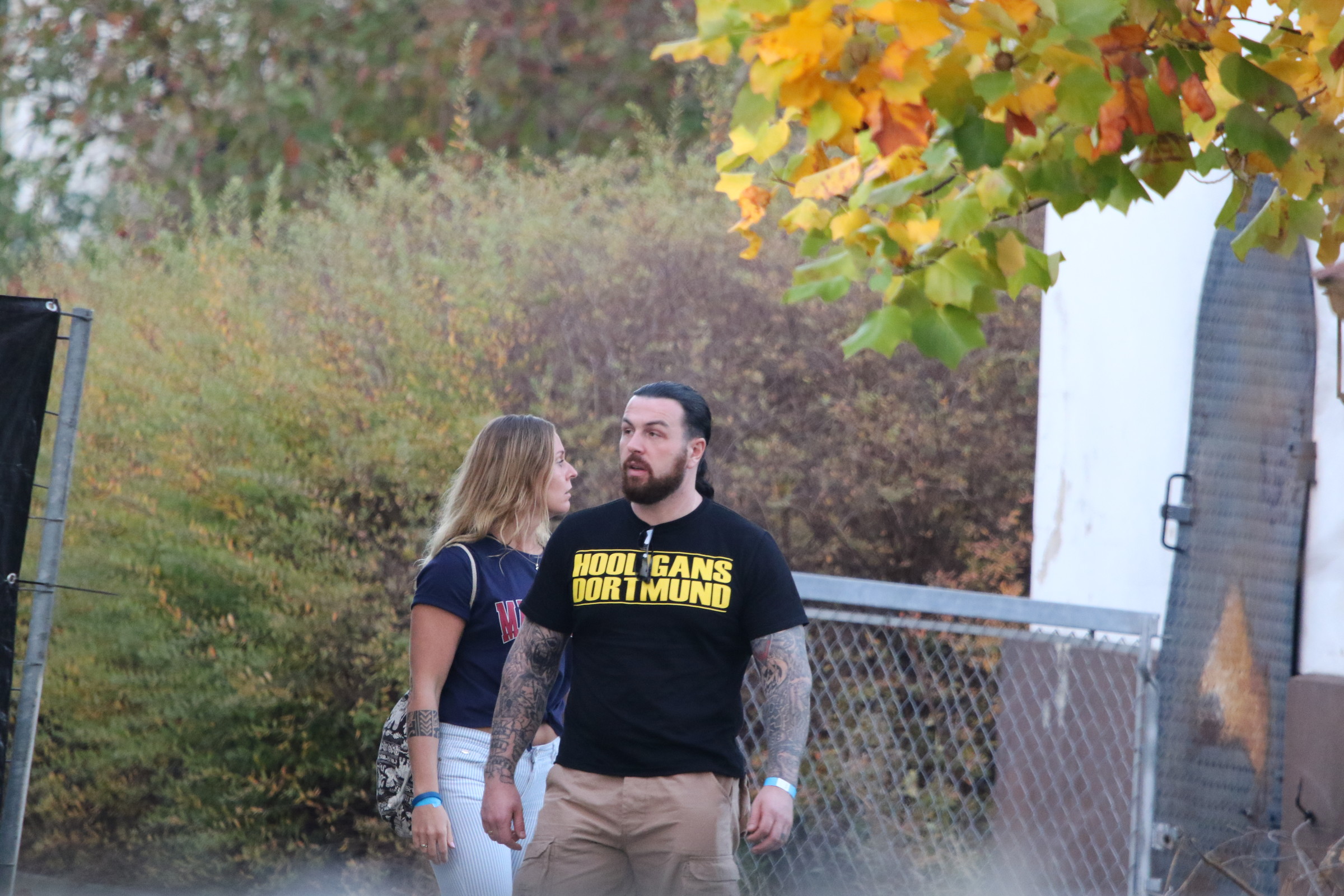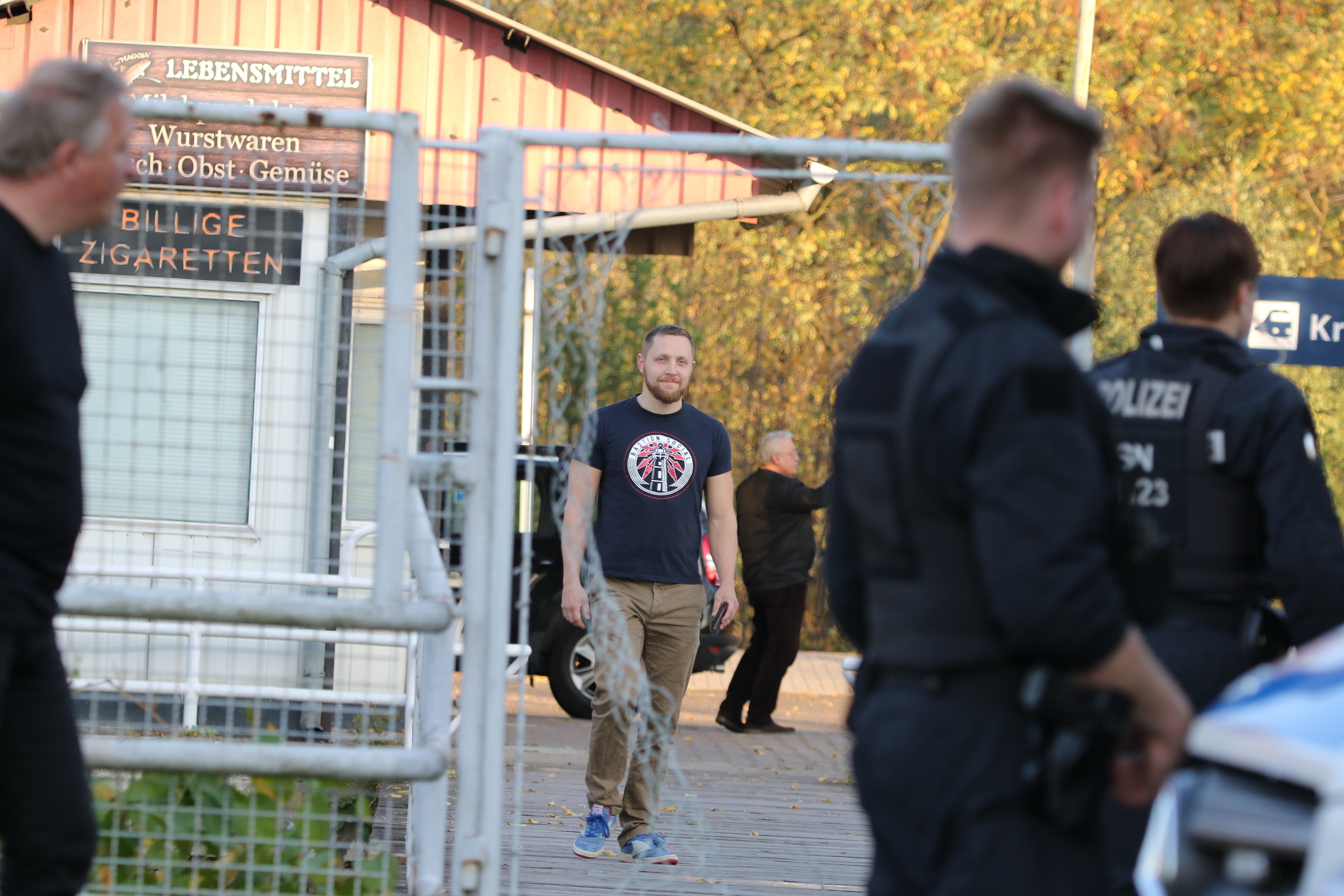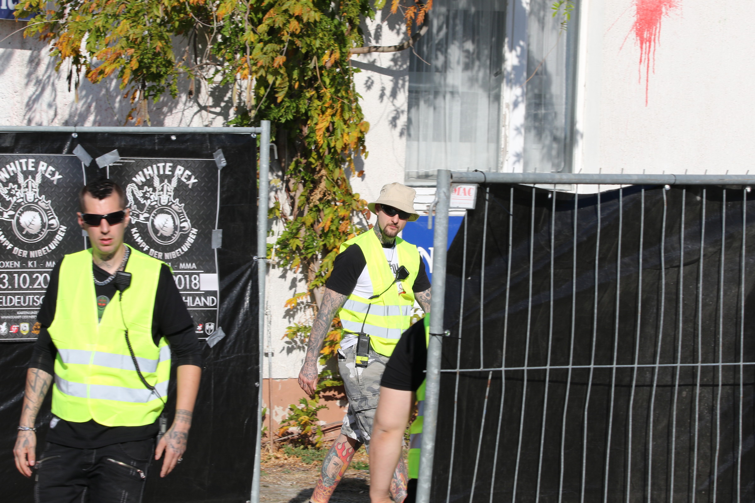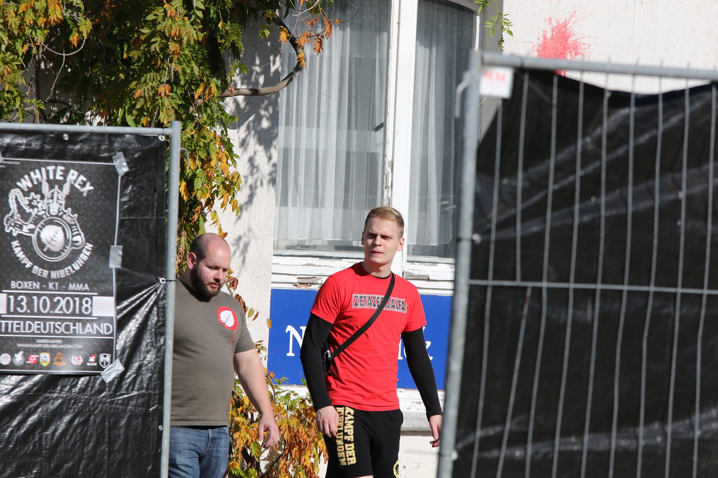 An exponierter Stelle als Ordner eingesetzt, war auch Robin Schmiemann aus Dortmund als Teil der Orga erkenntlich. Er gehört der Führungsriege des deutschen Ablegers der rechts-terroristischen Gruppe „Combat 18“ an. Die Verbindung von Schmiemann zum KdN könnte zum einen über seinen Vertrauten, den extrem rechten Dortmunder Kampfsportler Kevin Kruck, entstanden sein, der im Rahmen der Turniere des KdN schon als Punkterichter involviert war und das als Abgesandter des KdN-Teams u.a. 2017 auf dem „Force & Honneur“ in Frankreich anwesend war. Zum anderen ist Schmiemann auch selbst Hobby-Kampfsportler und gilt zudem als enger Wegbegleiter von Thorsten Heise, u.a. NPD-Führungsperson, „Combat 18“-Unterstützer und Hauptorganisator des „Schild & Schwert“-Festivals in Ostritz. Heises politischer Ziehsohn Gianluca Bruno war schließlich auch in den reibungslosen Ablauf des KdN-Turnier am 13. Oktober 2018. So war er an den Kooperationsgesprächen mit der Polizei am Tag selbst beteiligt und begleitete Deptolla auf dem polizeilichen Rundgang über das Gelände des Hotel „Neisseblick“.