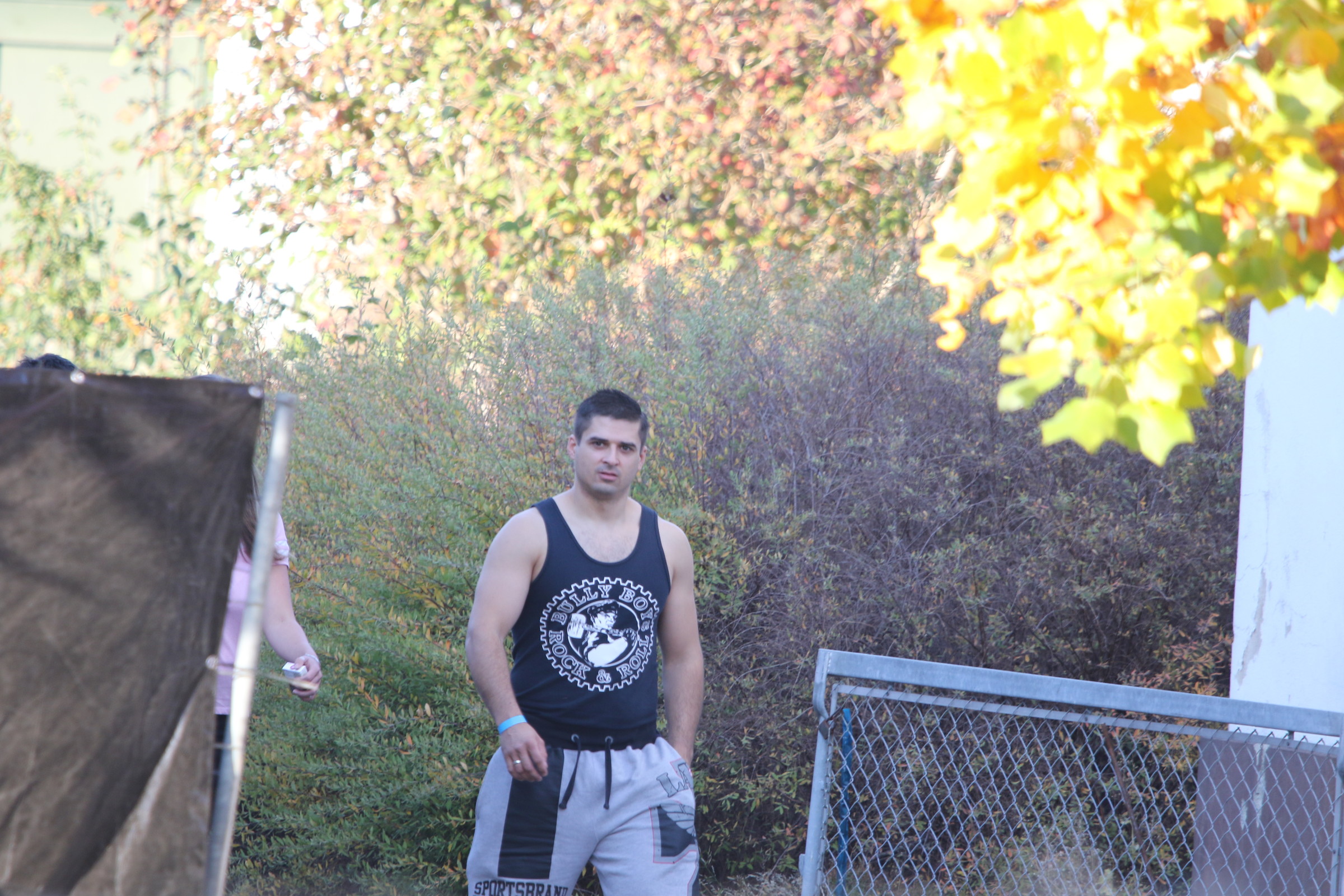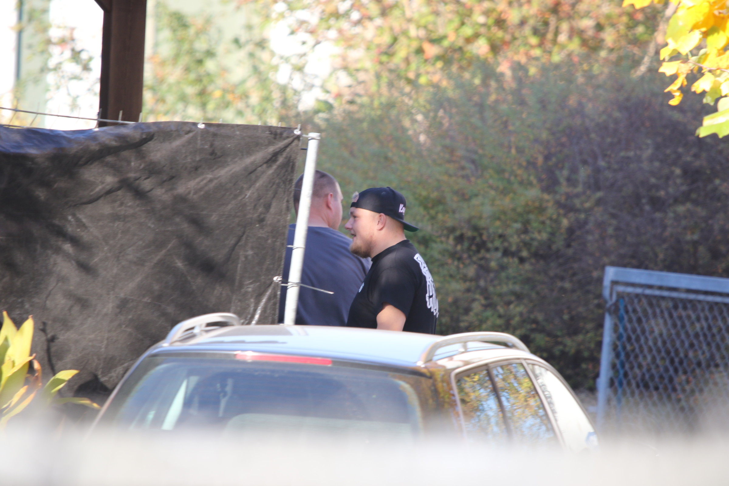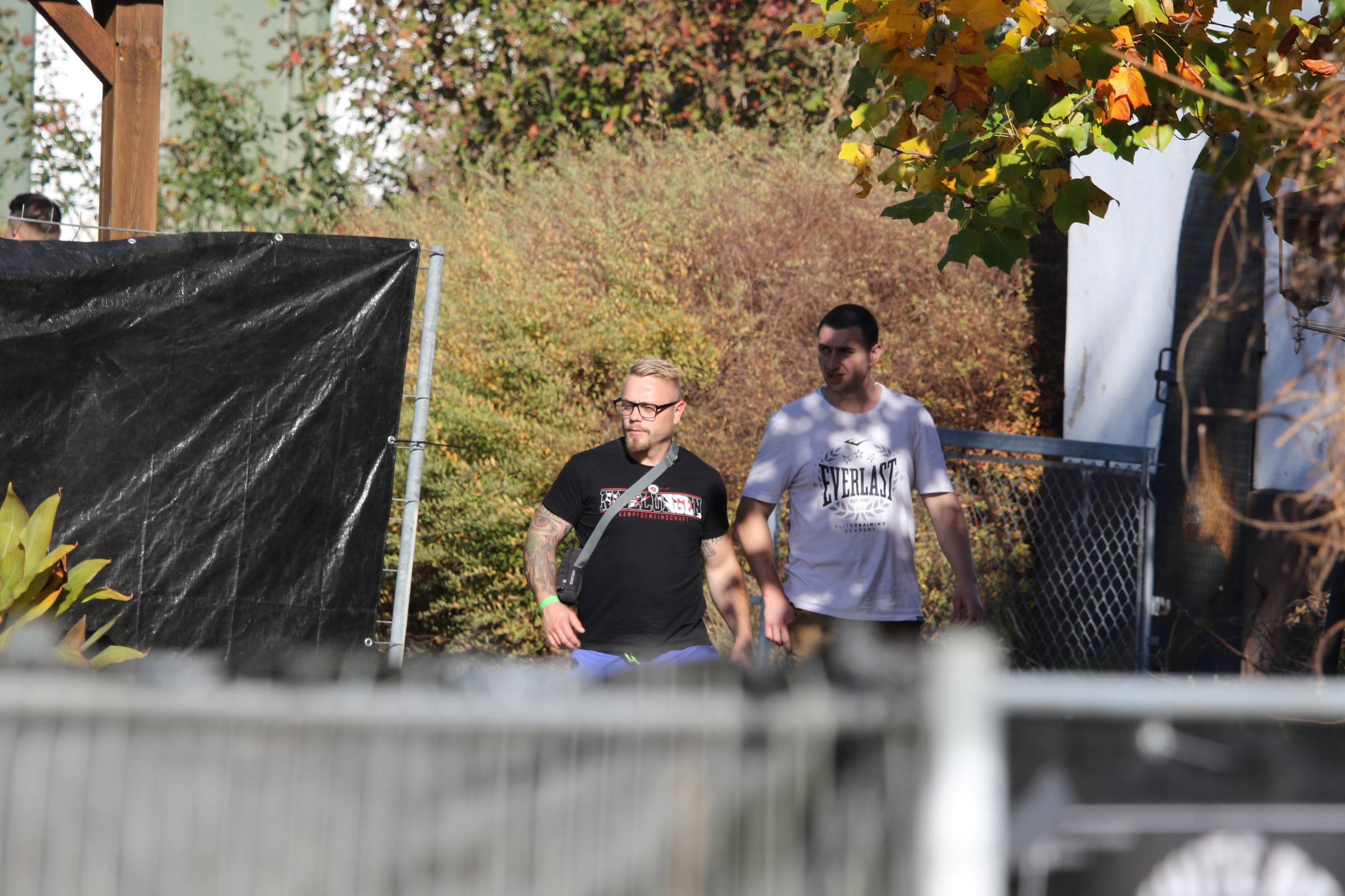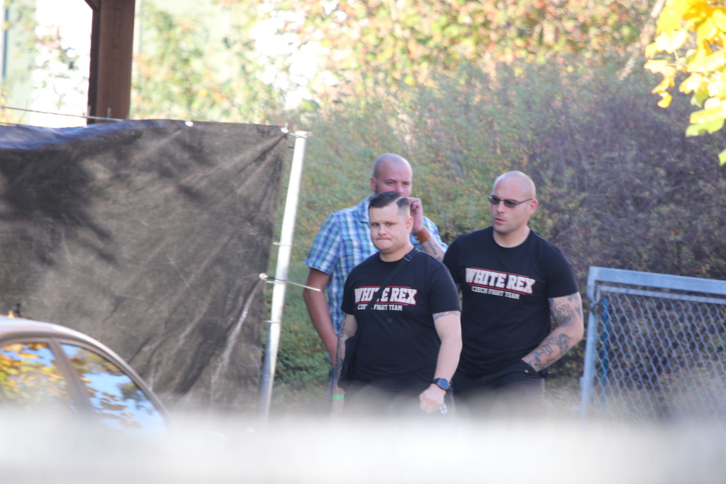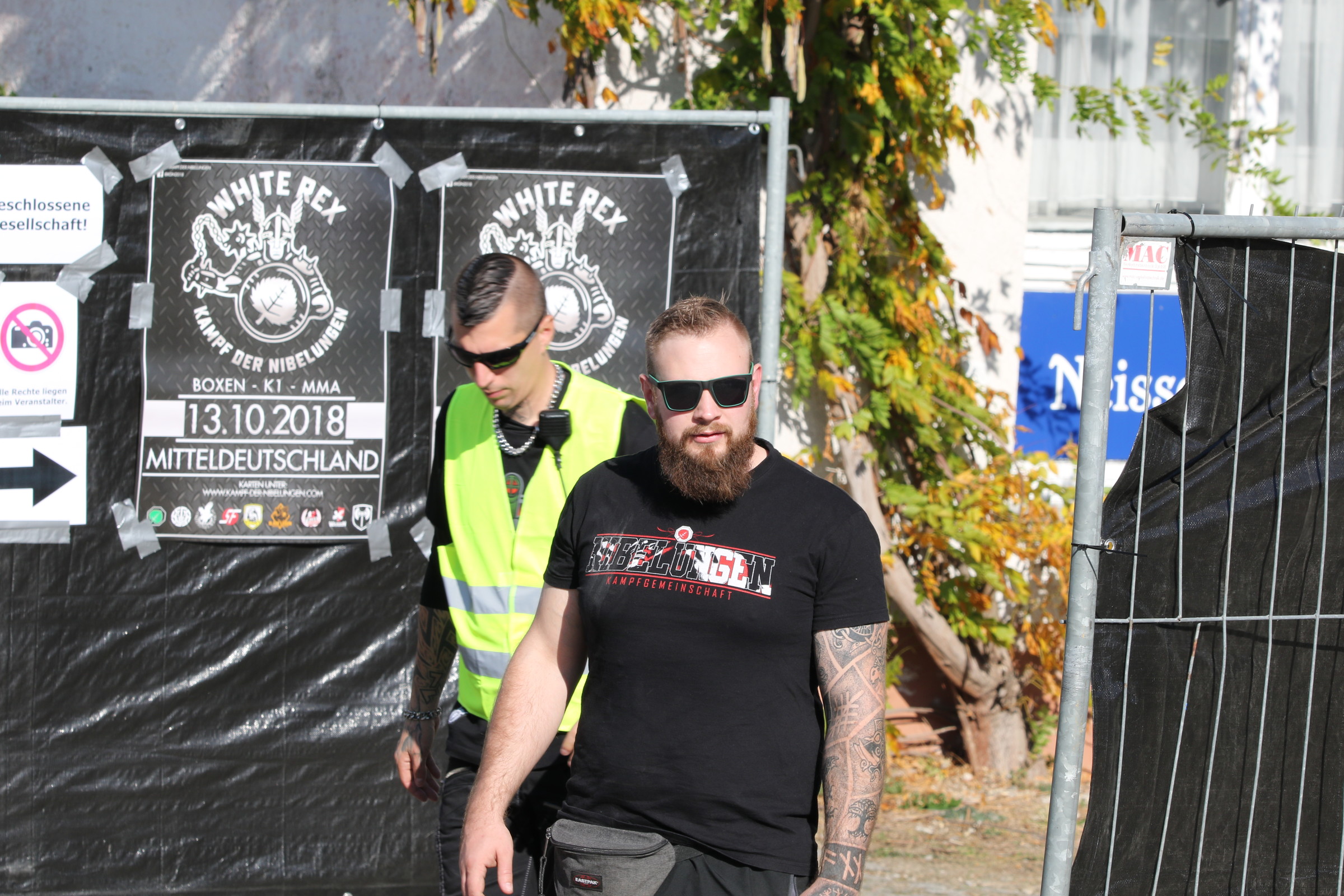 Wenn Medien über Neonazis im Kampfsport berichten, dann wir der fließend deutsch sprechende russische Neonazi, Hooligan und Gründer der Kampfsport-Promotion „White Rex“ Denis Nikitin oftmals als zentrale Figur genannt. Zu Recht, denn er gilt als Stichwortgeber für die wachsende extrem rechte Kampfsportszene. Seit 2008 reist der mittlerweile in Kiew wohnhafte Nikitin durch Europa und unterstützt alle relevanten rechten Turniere und Gruppen. Für den KdN gilt er als Hauptsponsor, sein Label „White Rex“ stand in diesem Jahr zum ersten Mal als Mitveranstalter des Turniers auf den Plakaten. Am 13. Oktober reiste Nikitin schon früh mit den zwei „Nummerngirls“ an. Sichtlich verärgert war er von den anwesenden Journalist_innen, die ohne dass er es beeinflussen konnte, Fotos von ihm schossen. Denn Nikitins täglich Brot ist nicht nur die Vermarktung von „White Rex“, sondern auch die Selbstinszenierung. Dabei bestimmte er bisher nur allein, welchen Formaten er Interviews gab und wer ihn fotografieren durfte. Journalist_innen widmen sich seiner Person teilweise mit seitenlangen Portraits. In Ostritz wirkte er auf die anwesenden Berichterstatter_innen während seiner Anreise zunächst aggressiv, ließ sich jedoch kurz darauf auf selbstdarstellerische Posen ein.