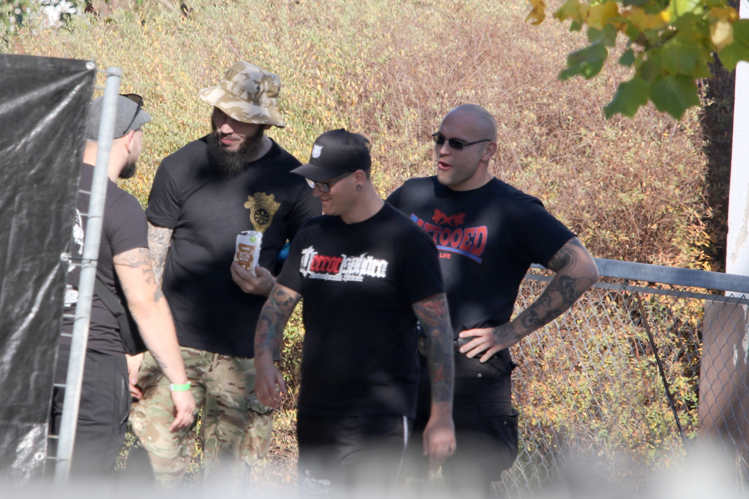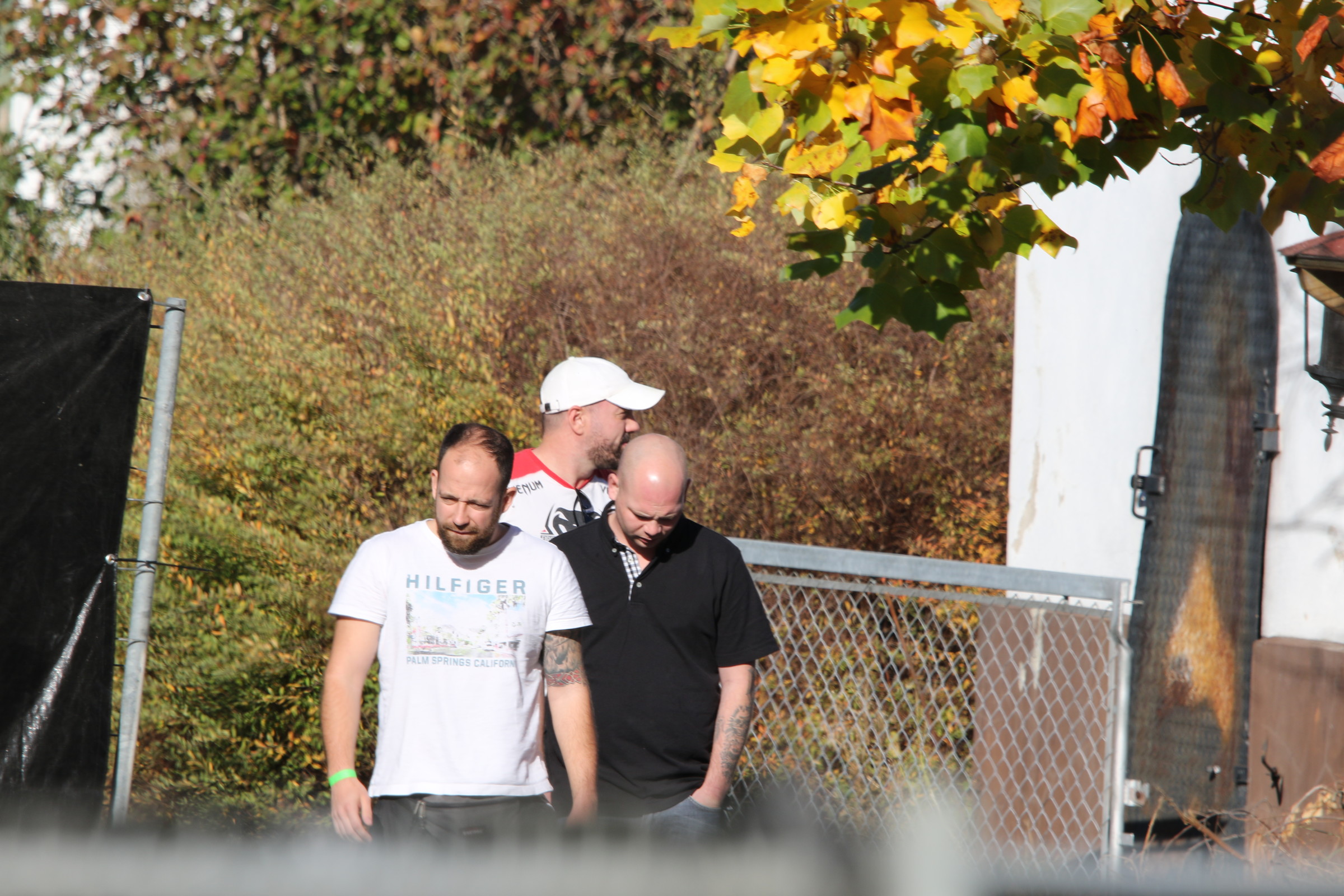 Mittig, anhand seiner großflächigen auf dem Arm tätowierten Flügel erkennbar: William „Willi“ Puder aus Cottbus (Quelle: Pixel-Archiv)