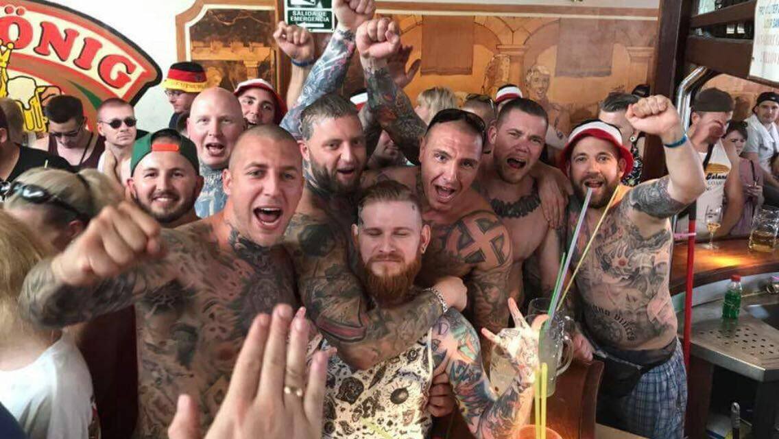 Saufgelage auf Mallorca im Sommer 2017. Dabei war u.a. Jan Zrzodelny (1.v.r.) und die „Hammerskins“ Dennis Kiebitz (hinten links mit Glatze), Wolfang Erwin Benkesser (mit großflächigem Hakenkreuztattoo) und Marco Berlinghof (links neben Benkesser) (Quelle: Screenshot Facebook)