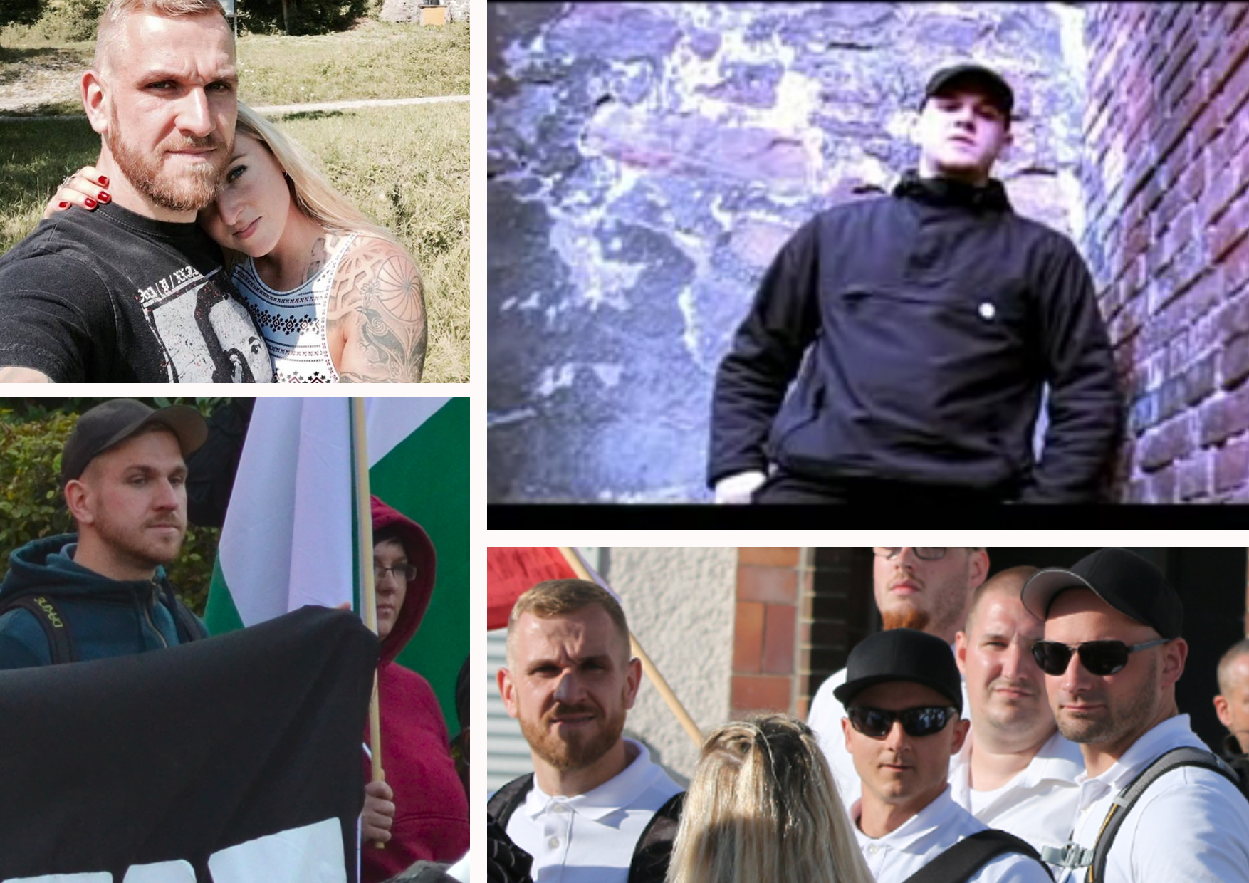 Jörg Henning auf diversen Aufmärschen. Unten Links in Döbeln 2013 (Quelle: Pixelarchiv), unten rechts beim „Rudolf Hess Marsch“ in Berlin 2017 (Quelle: Exif-Recherche), oben rechts als Mitwirkender in einem Video von „Media Pro Patria“ um 2009 und oben links mit seiner (Ex)-Partnerin, der rechten Kampfsportlerin Emma Gongora aus Marseille