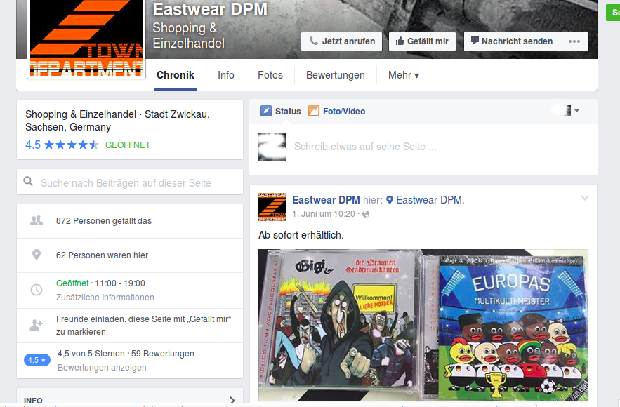 CDs von einschlägigen RechtsRock-Bands in Hampels „Eastwear Department“ in Zwickau (Bild: Screenshot Facebook 2016)