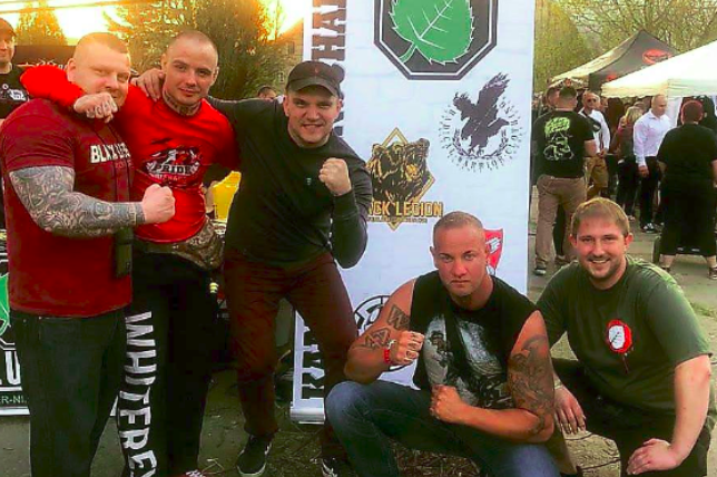 Tomasz Skatulsky und Denis Nikitin (2.&3. v. l.) sowie Alexander Deptolla (1.v.r.) 2018 in Ostritz, gemeinsam mit Vertretern von „Black Legion“ (Bild: Screenshot Facebook)