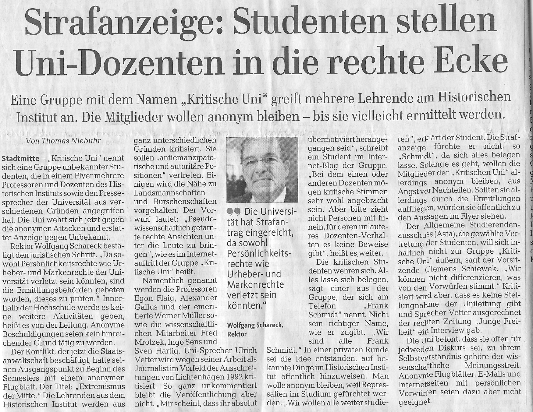 Kein Dementi vom Rektor So ist Rektor Scharecks Statement deutlich vorsichtiger als das seines Pressesprechers. Hatte der u.a. wegen seiner Rolle in der Rostocker Presselandschaft zur Zeit des Pogroms von Lichtenhagen kritisierte Ulrich Vetter gegenüber dem „Neues Deutschland“ noch getönt, dass gleich »mehrere Straftatbestände« in Betracht kämen. So hört sich das in der OZ nun so an: „Die Universität hat Strafantrag eingereicht, da sowohl Persönlichkeitsrechte wie Urheber- und Markenrechte verletzt sein könnten“. Kein Wort mehr von „Beleidigung“ oder „Übler Nachrede“ oder „Behauptung unwahrer Tatsachen“. Frank Schmidt, Sprecher der Gruppe Kritische Uni kommentiert dies so: „Offensichtlich ist den Verantwortlichen mittlerweile aufgefallen, dass die Vorwürfe belegt sind und der Wahrheit entsprechen“.