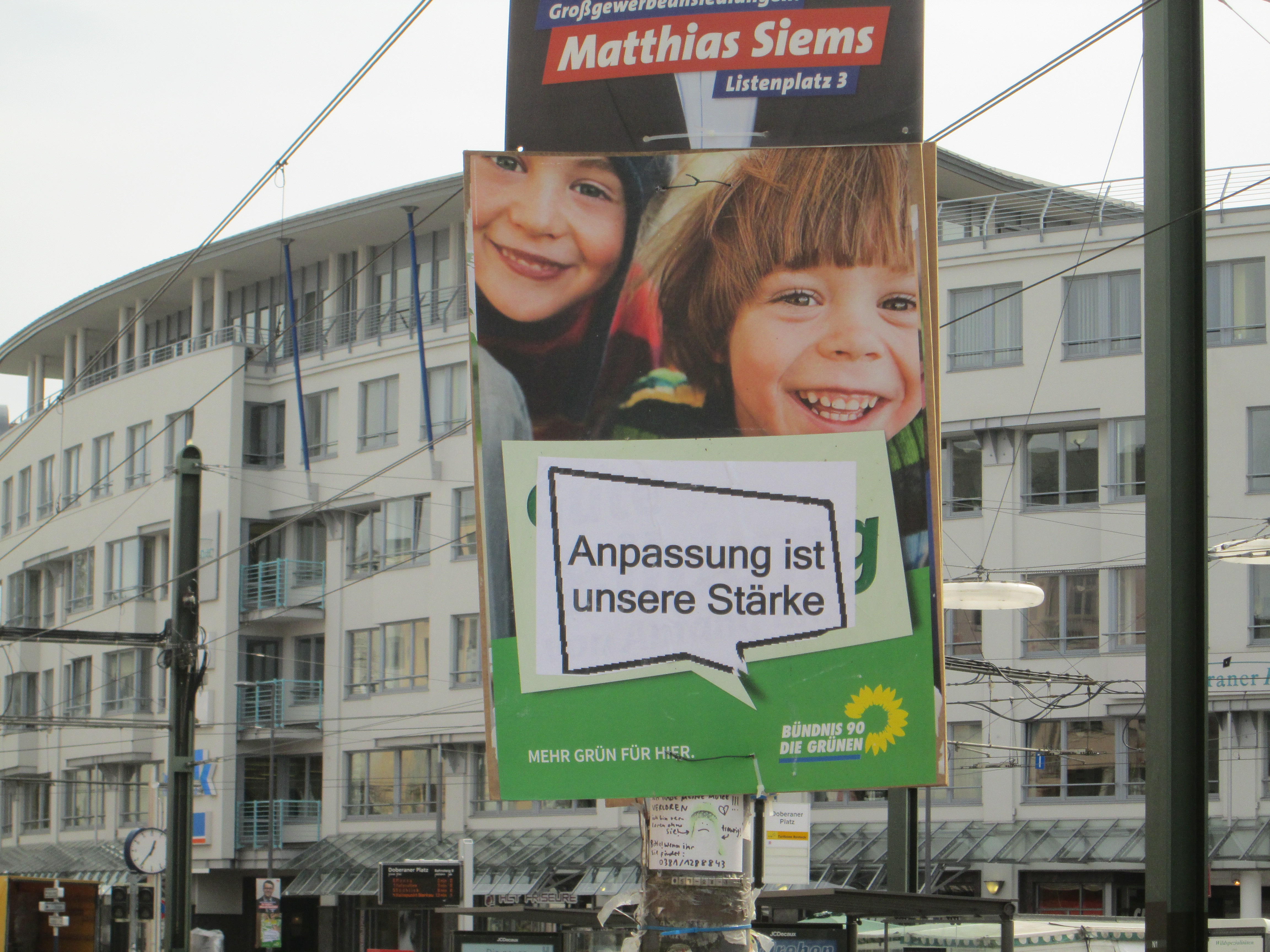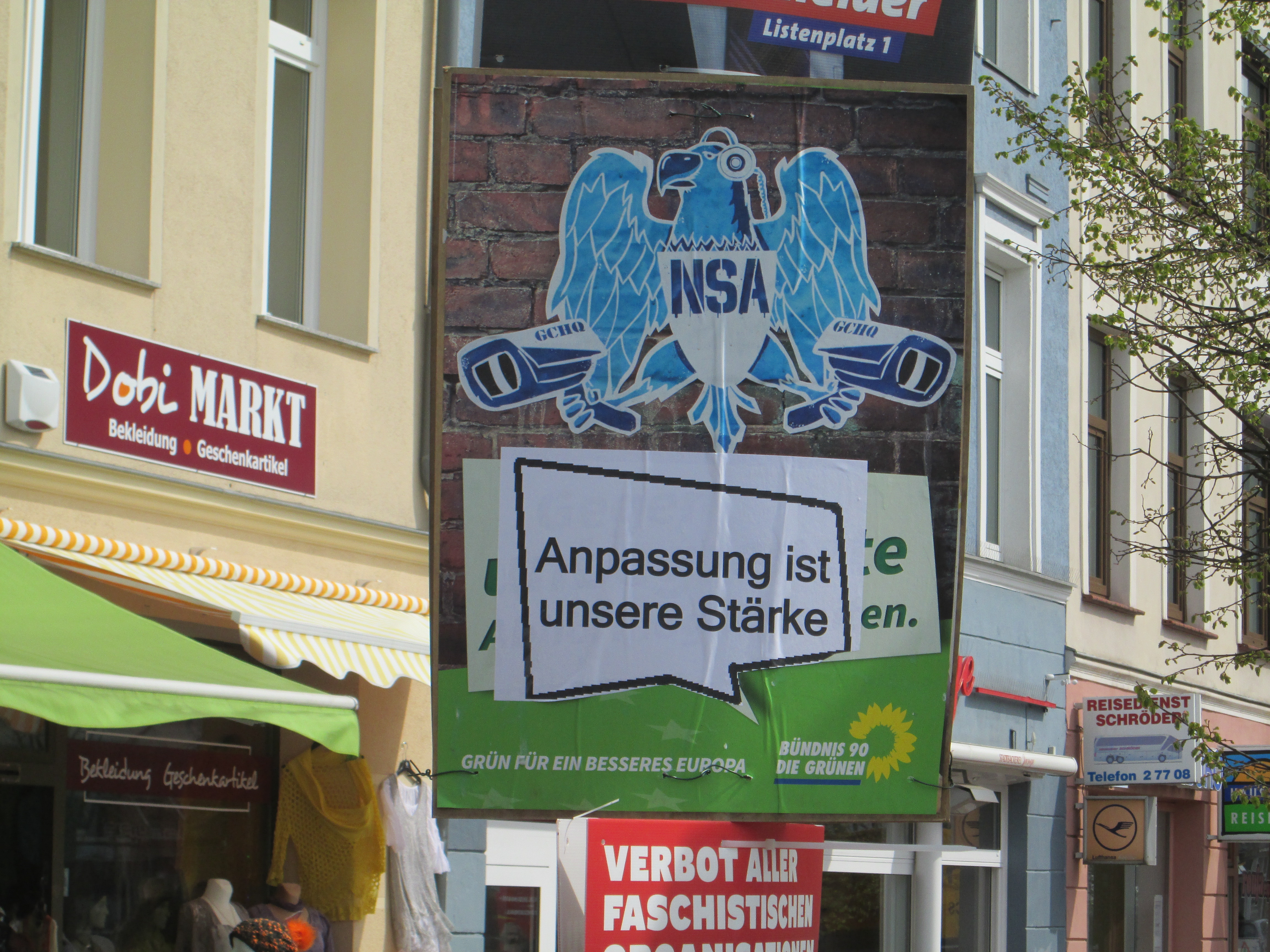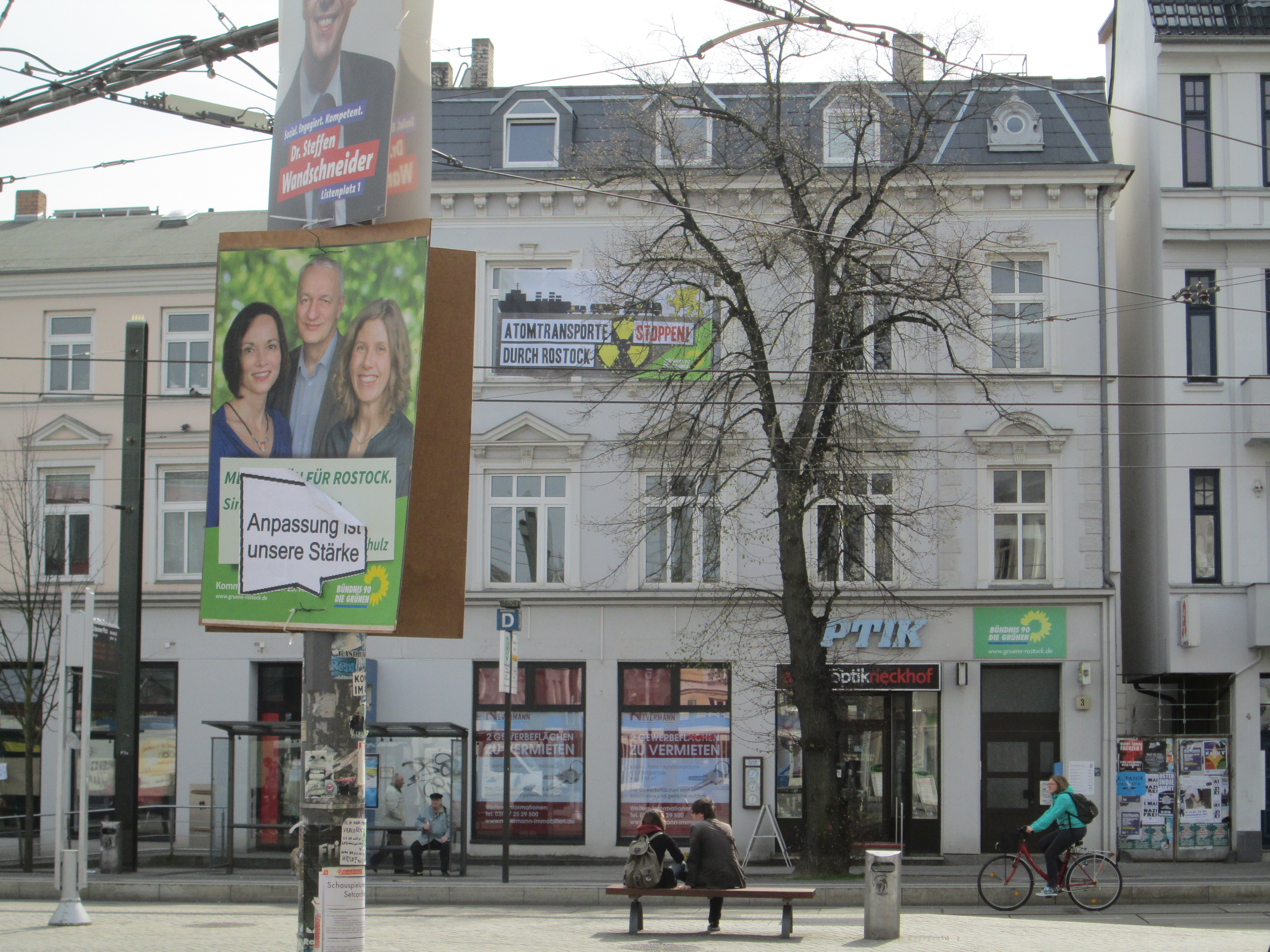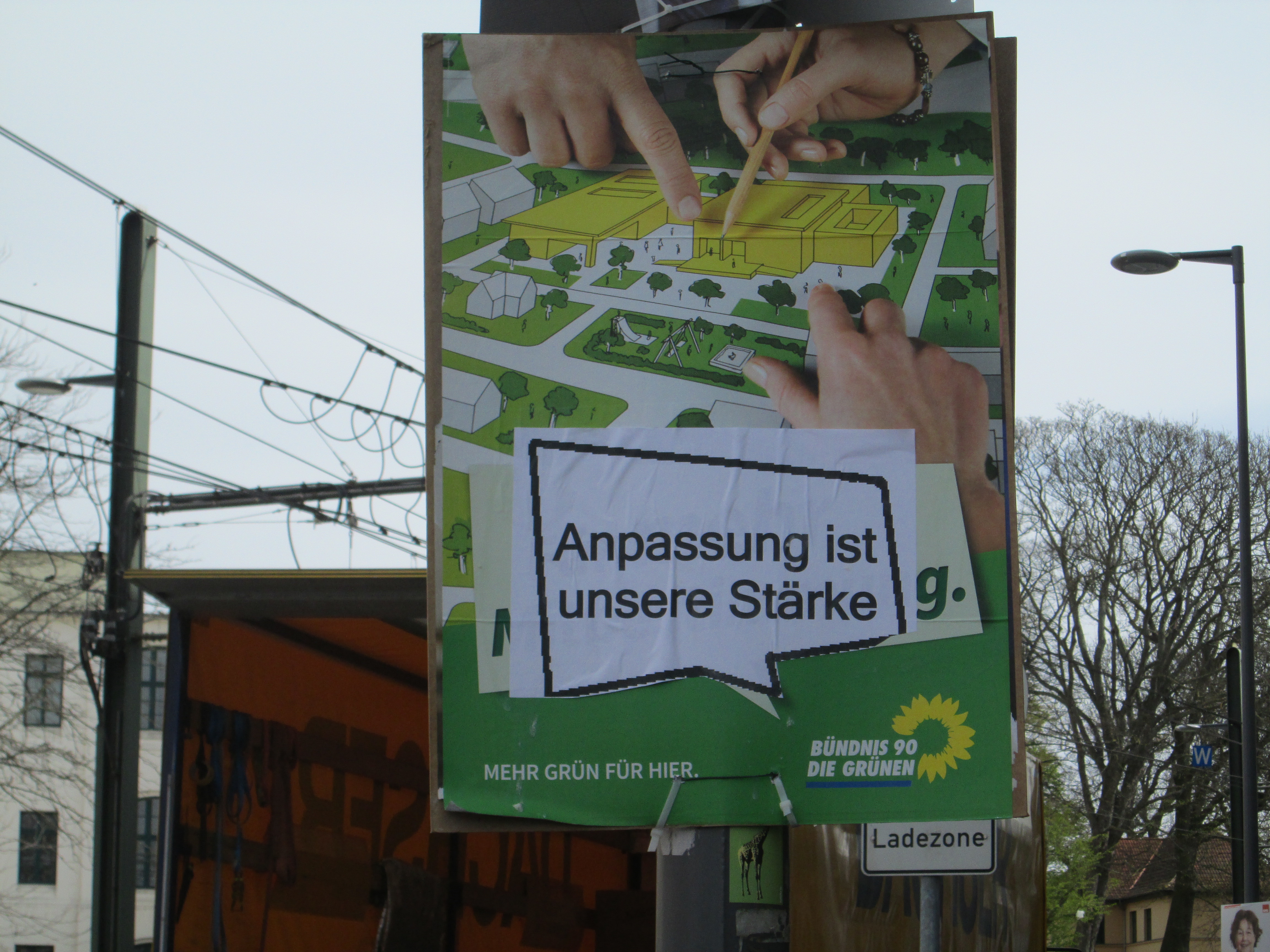 HRO: „Anpassung ist unsere Stärke.“ Grüne Dissident_innen verbessern Wahlplakate der Grünen am Doberaner Platz In der Nacht vom 16.4.2014 auf den 17.4.2014 haben wir uns in Rostock in den Auftakt des laufenden Europawahlkampf eingemischt. Unser Ziel waren dabei die Wahlplakate der Grünen am Doberaner Platz. Mit dem Slogan „Anpassung ist unsere Stärke“ haben wir die Plakate rund um die Rostocker Kreisgeschäftsstelle ergänzt. Mit diesem Vorschlag zur Gestaltung ihrer Außendarstellung möchten wir unseren Parteifreund_innen nahe legen, sich auch bei unserer Werbung auf unsere Kernkompetenzen zu besinnen und dem Wählern und Wählerinnen ein realistisches Bild grüner Politik zu vermitteln.