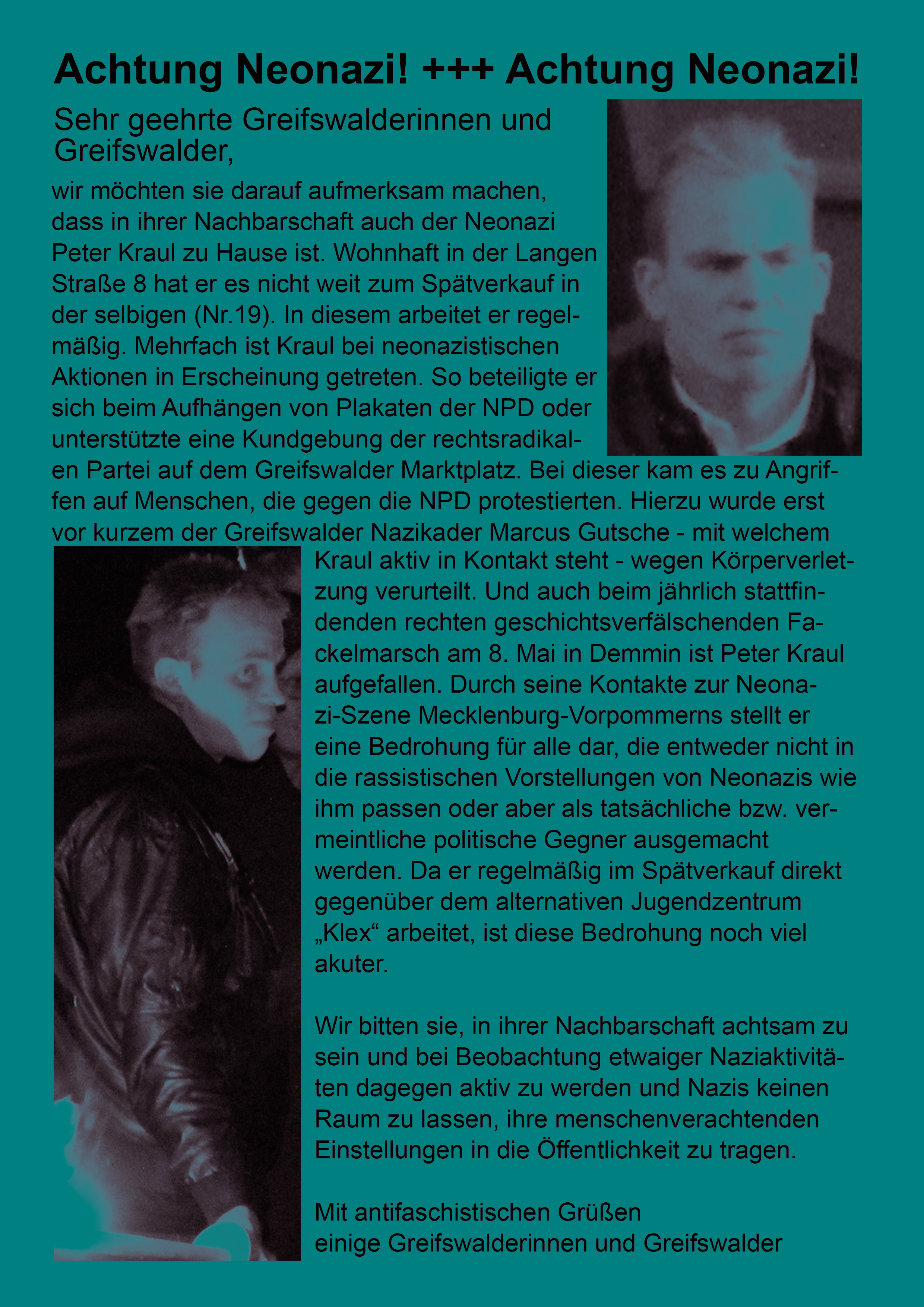 wir möchten sie darauf aufmerksam machen, dass in ihrer Nachbarschaft auch der Neonazi Peter Kraul zu Hause ist. Wohnhaft in der Langen Straße 8 hat er es nicht weit zum Spätverkauf in der selbigen (Nr.19). In diesem arbeitet er regelmäßig. Mehrfach ist Kraul bei neonazistischen Aktionen in Erscheinung getreten. So beteiligte er sich beim Aufhängen von Plakaten der NPD oder unterstützte eine Kundgebung der rechtsradikalen Partei auf dem Greifswalder Marktplatz. Bei dieser kam es zu Angriffen auf Menschen, die gegen die NPD protestierten. Hierzu wurde erst vor kurzem der Greifswalder Nazikader Marcus Gutsche – mit welchem Kraul aktiv in Kontakt steht – wegen Körperverletzung verurteilt. Und auch beim jährlich stattfindenden rechten geschichtsverfälschenden Fackelmarsch am 8. Mai in Demmin ist Peter Kraul aufgefallen. Durch seine Kontakte zur Neonazi-Szene Mecklenburg-Vorpommerns stellt er eine Bedrohung für alle dar, die entweder nicht in die rassistischen Vorstellungen von Neonazis wie ihm passen oder aber als tatsächliche bzw. vermeintliche politische Gegner ausgemacht werden. Da er regelmäßig im Spätverkauf direkt gegenüber dem alternativen Jugendzentrum „Klex“ arbeitet, ist diese Bedrohung noch viel akuter.
