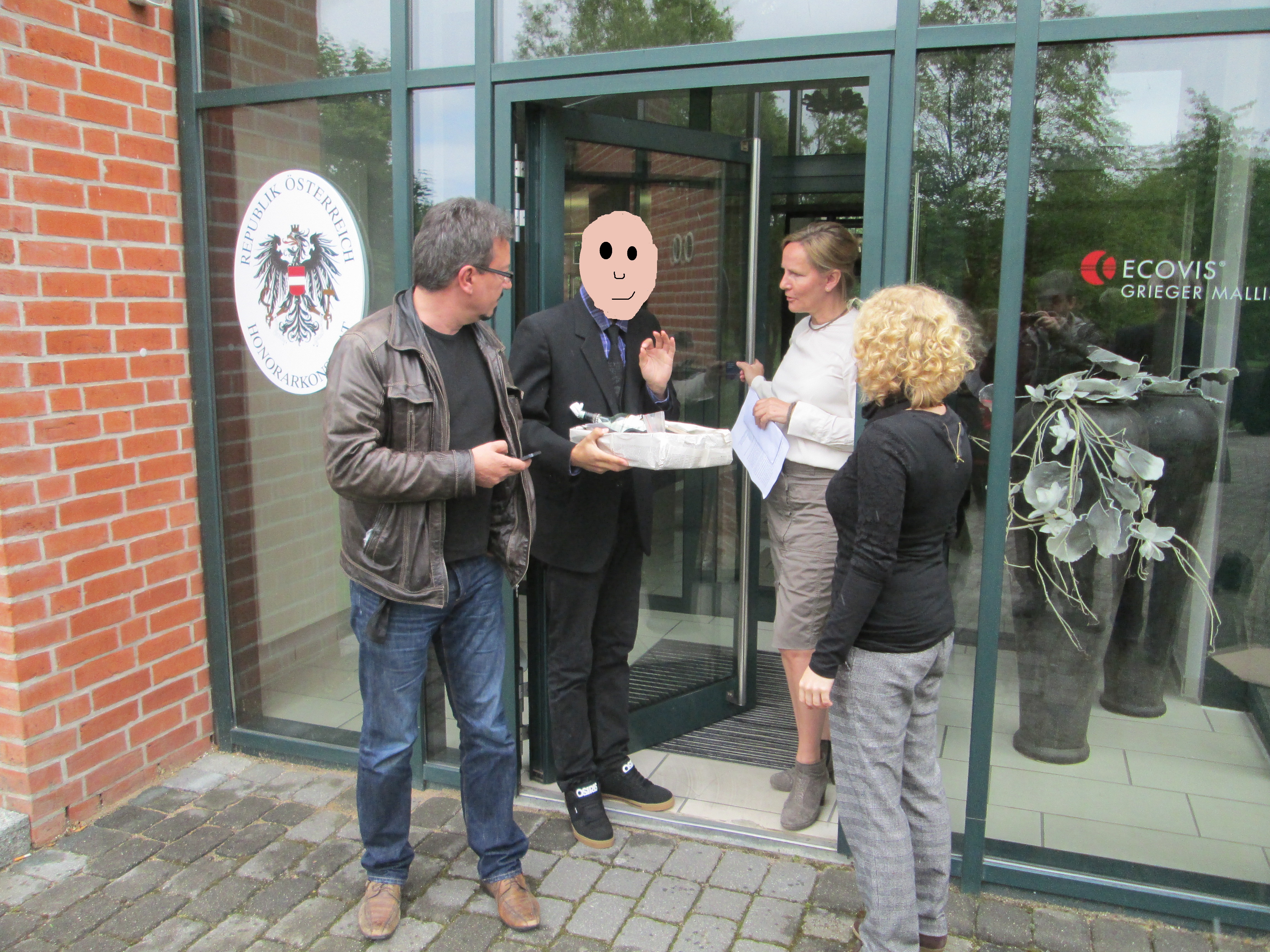 Mit der Aktion wollte sich die Rostocker Soligruppe „Free Josef“ sich Josef S. gegenüber solidarisch zeigen und die willkürliche Inhaftierung anprangern, sowie die Kriminalisierung antifaschistischer Proteste im Allgemeinen kritisieren. Um die politische Motivation des Verfahrens gegen Josef aufzuzeigen, sollte dem Honorarkonsul Wolfgang Grieger ( http://www.honorarkonsul.at/) ein Präsentkorb voller lächerlicher Beweise überreicht werden. Der Korb enthielt hübsch aufgemacht vermeintliche Beweisstücke, die in ihrer Qualität und Aussagekraft denen der Wiener Staatsanwaltschaft im Verfahren gegen Josef ähneln: Eine leere Flasche Wein, Streichhölzer, ein dreckiger Handschuh, eine linke Zeitung und ein schwarzer Pullover. Leider war der Konsul nicht anwesend, um die Beweise in Empfang zu nehmen. Aber zumindest die Petition wurde durch eine Angestellte entgegen genommen.