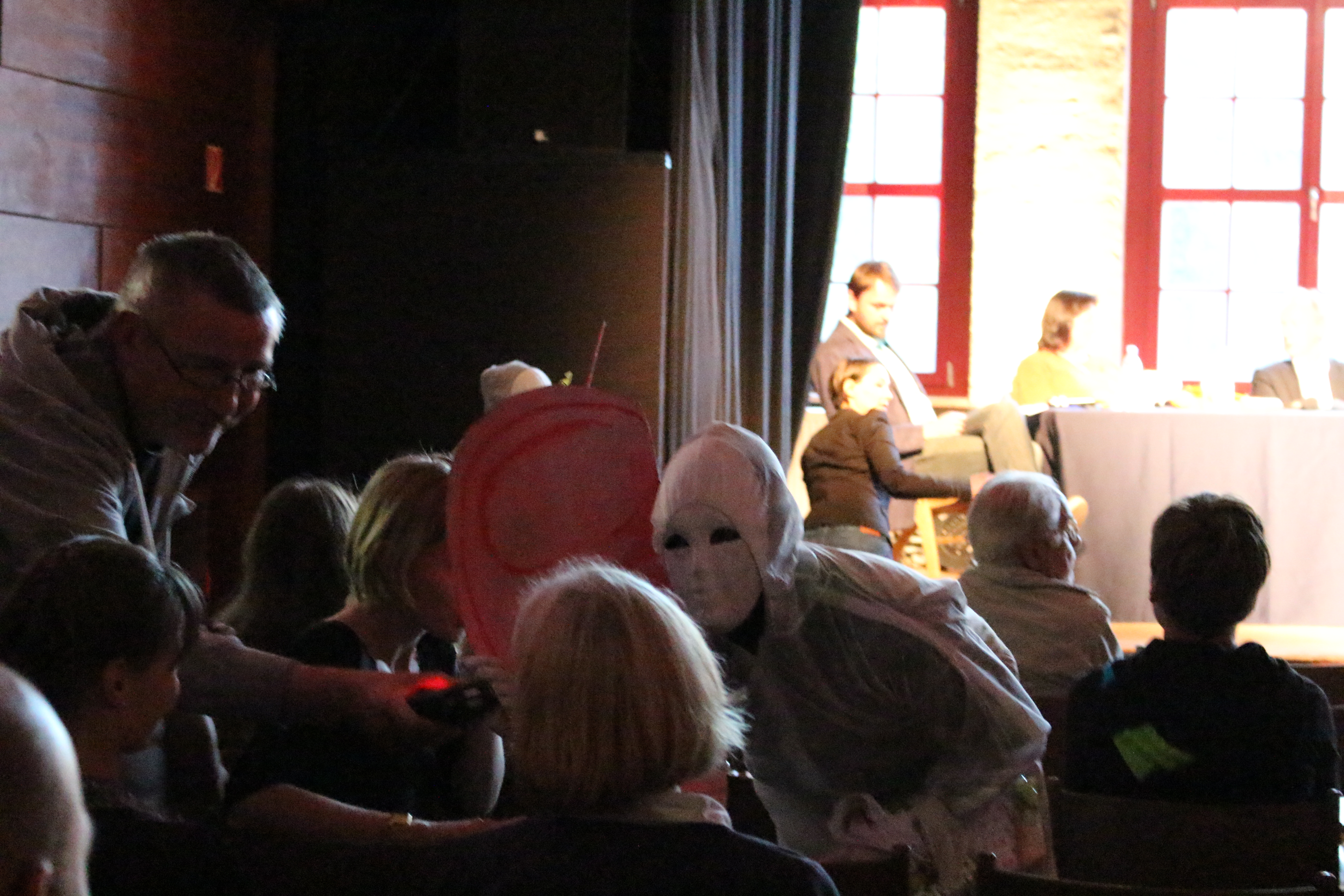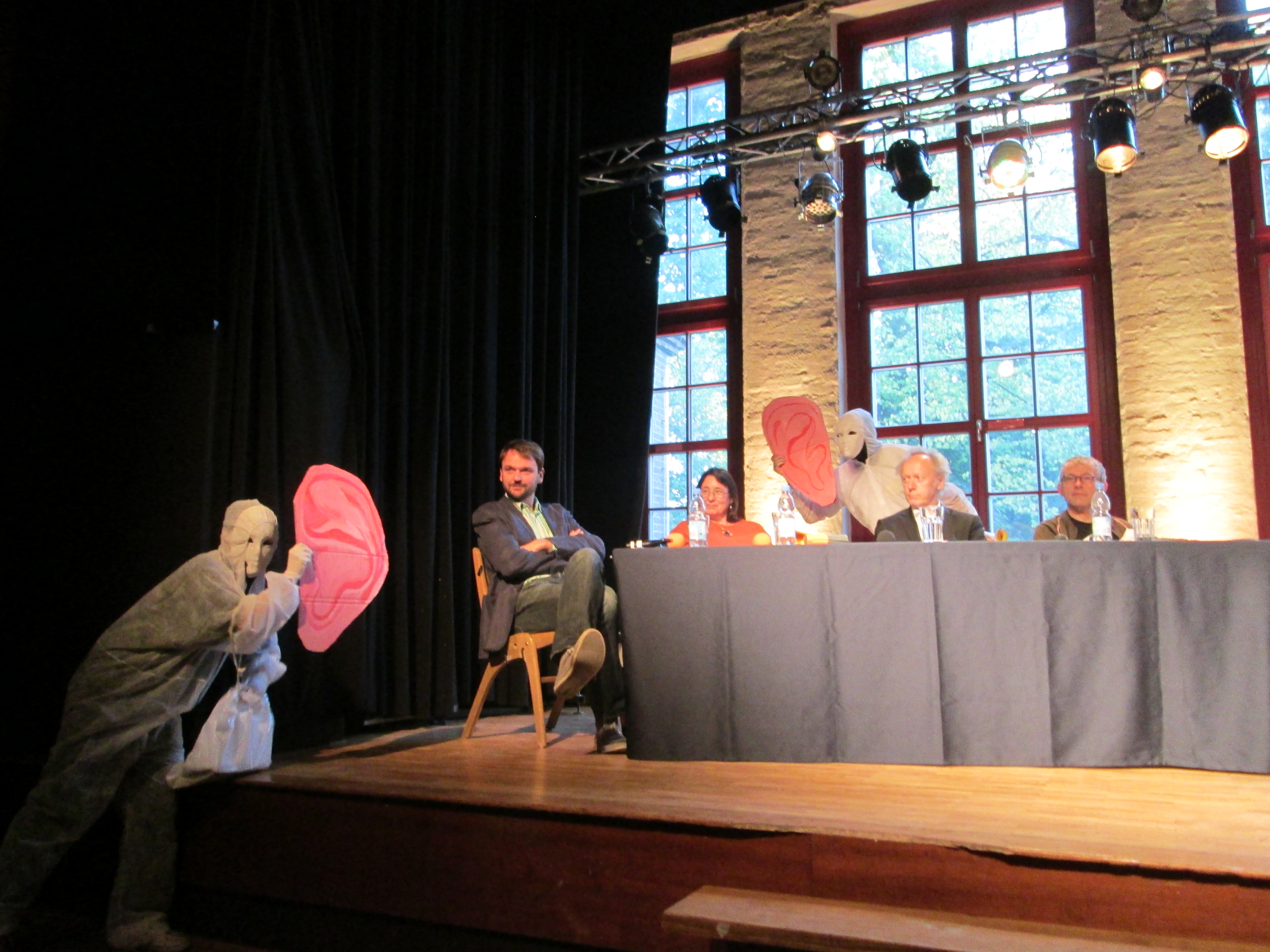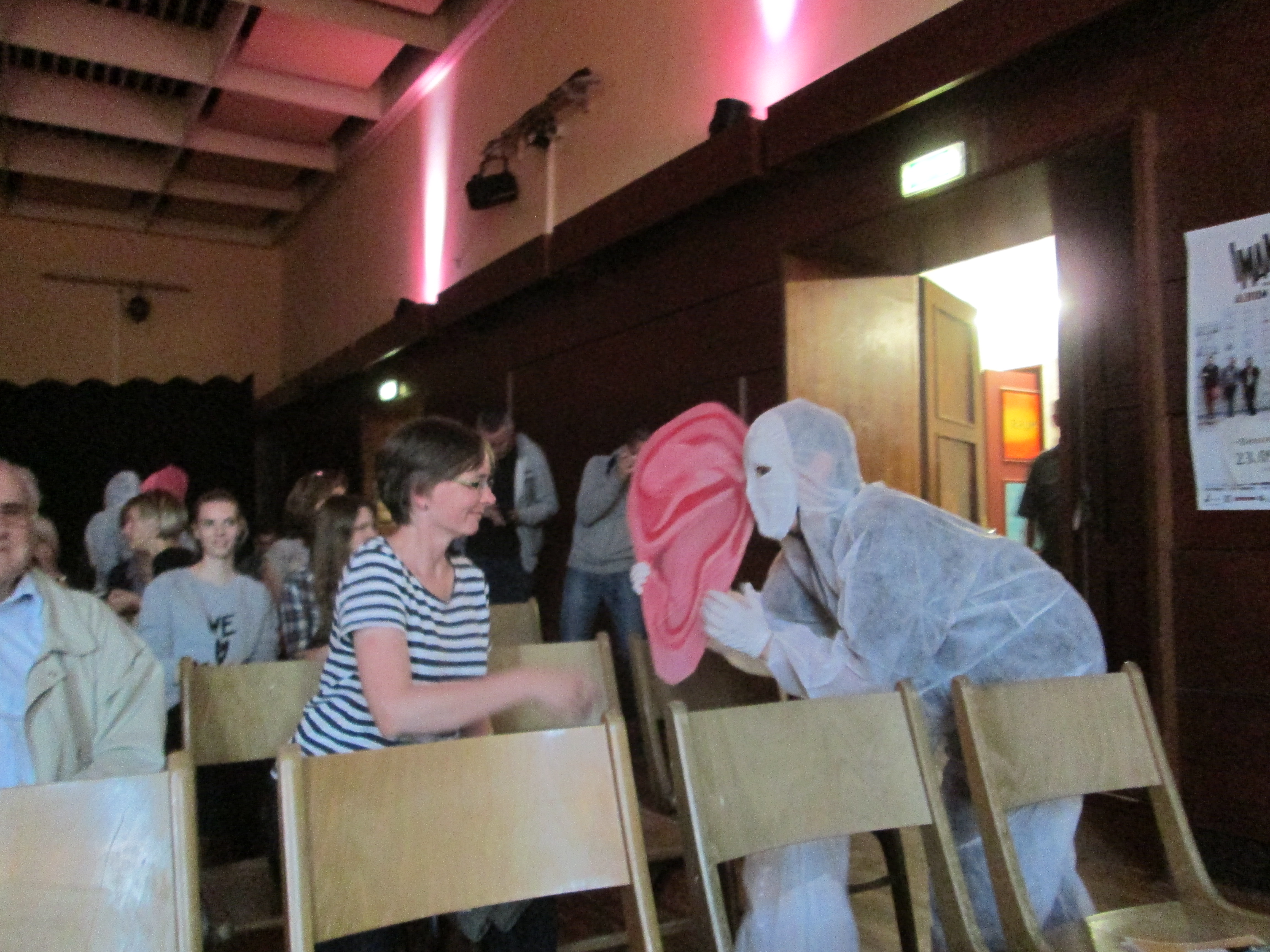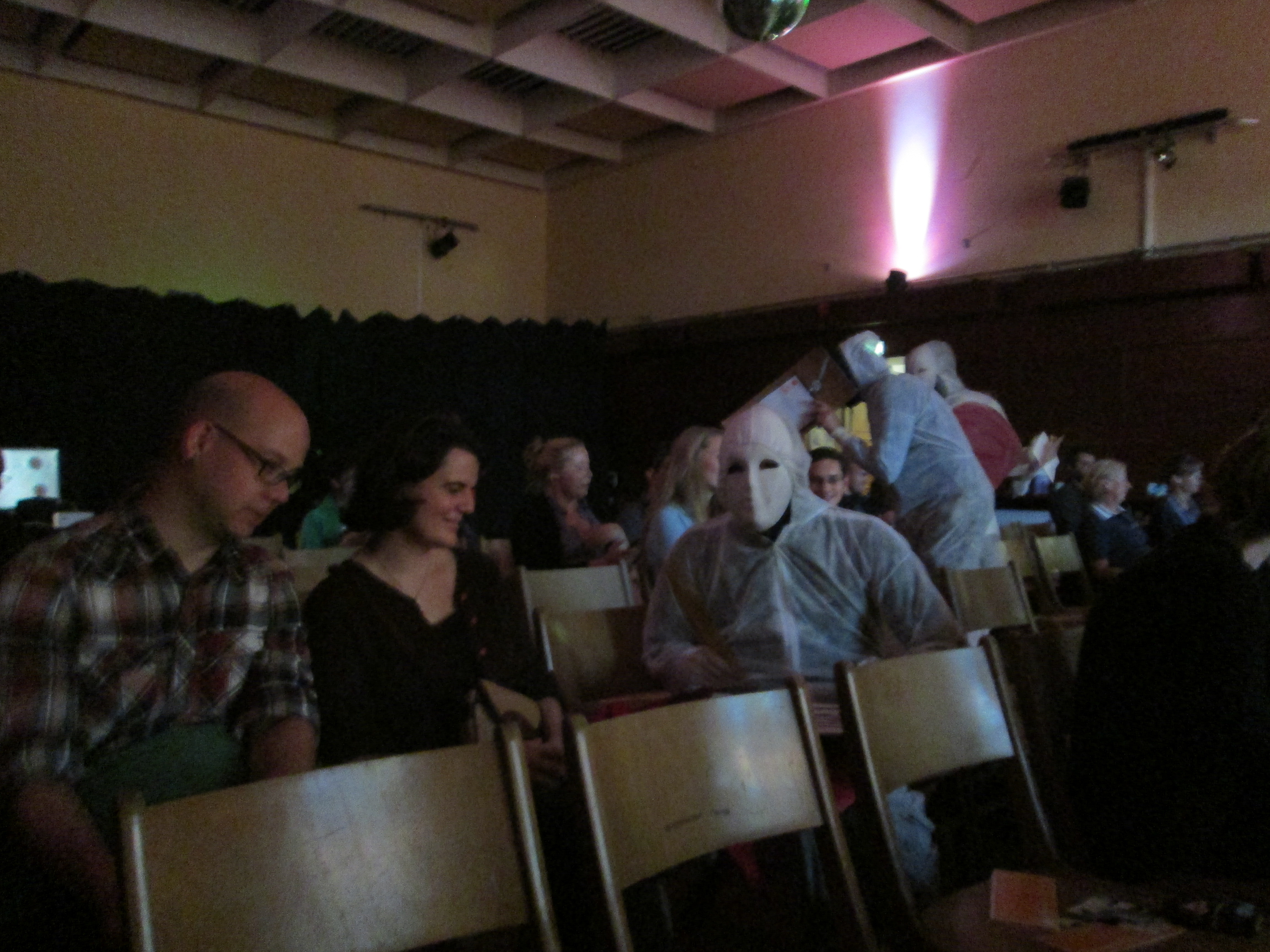 Den Beginn der Lesung begleitete die Gruppe in weisen Anzügen mit weisen Theatermasken als „antropromorphe Personalisierung“ der Überwachung. Mit überdimensionierten Ohren und Augen ausgestattet bespitzelten die als Überwachung in Person gestylten TeilnehmerInnen das Publikum. Außerdem überreichten die Verkleideten den beiden Profs die „Überwachungs-Nebelkerze 2014“ und verteilten entsprechende Ehrenurkunden. Auf diesem erklärte die Theatergruppe auch ihr Anliegen.