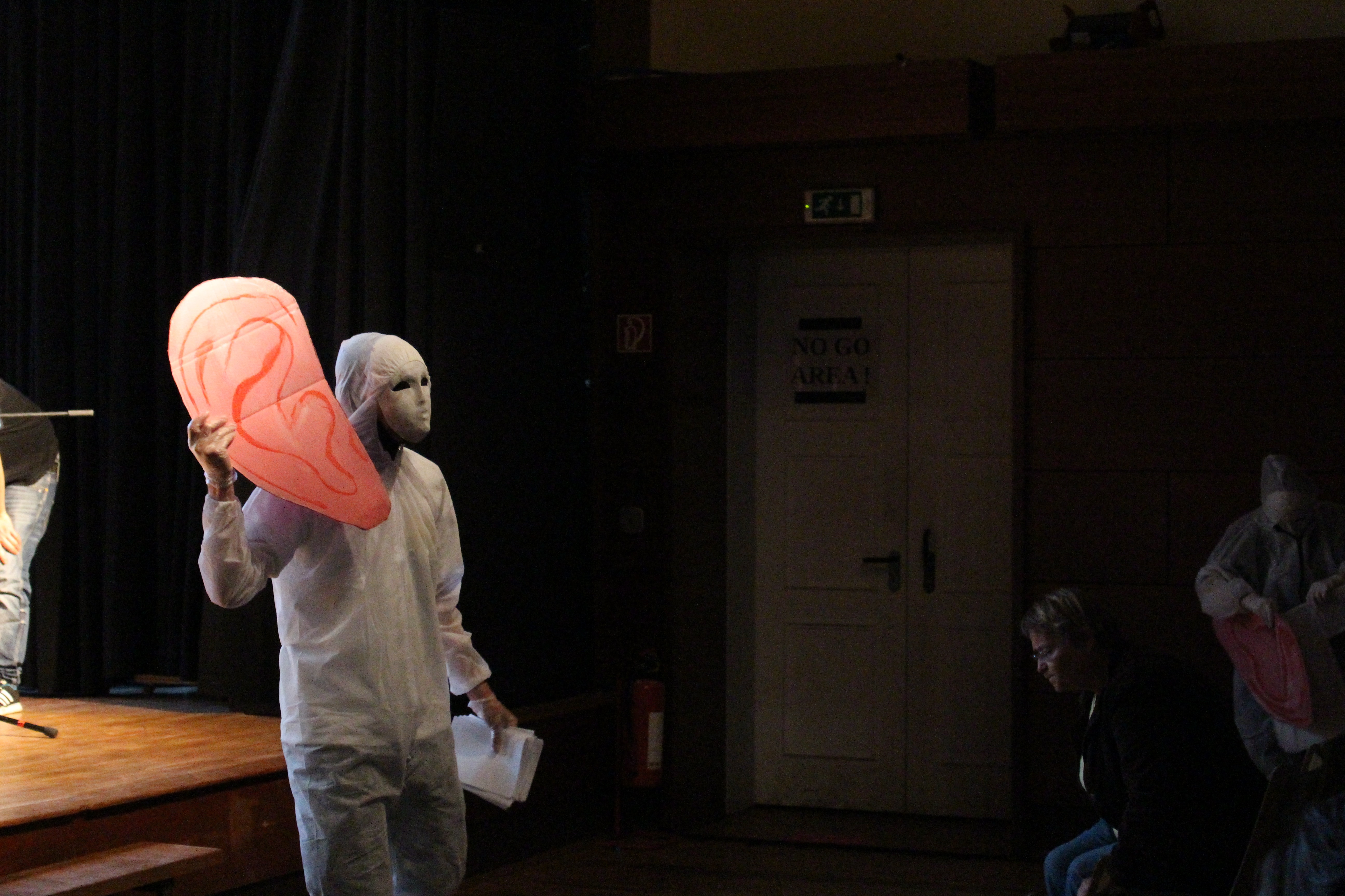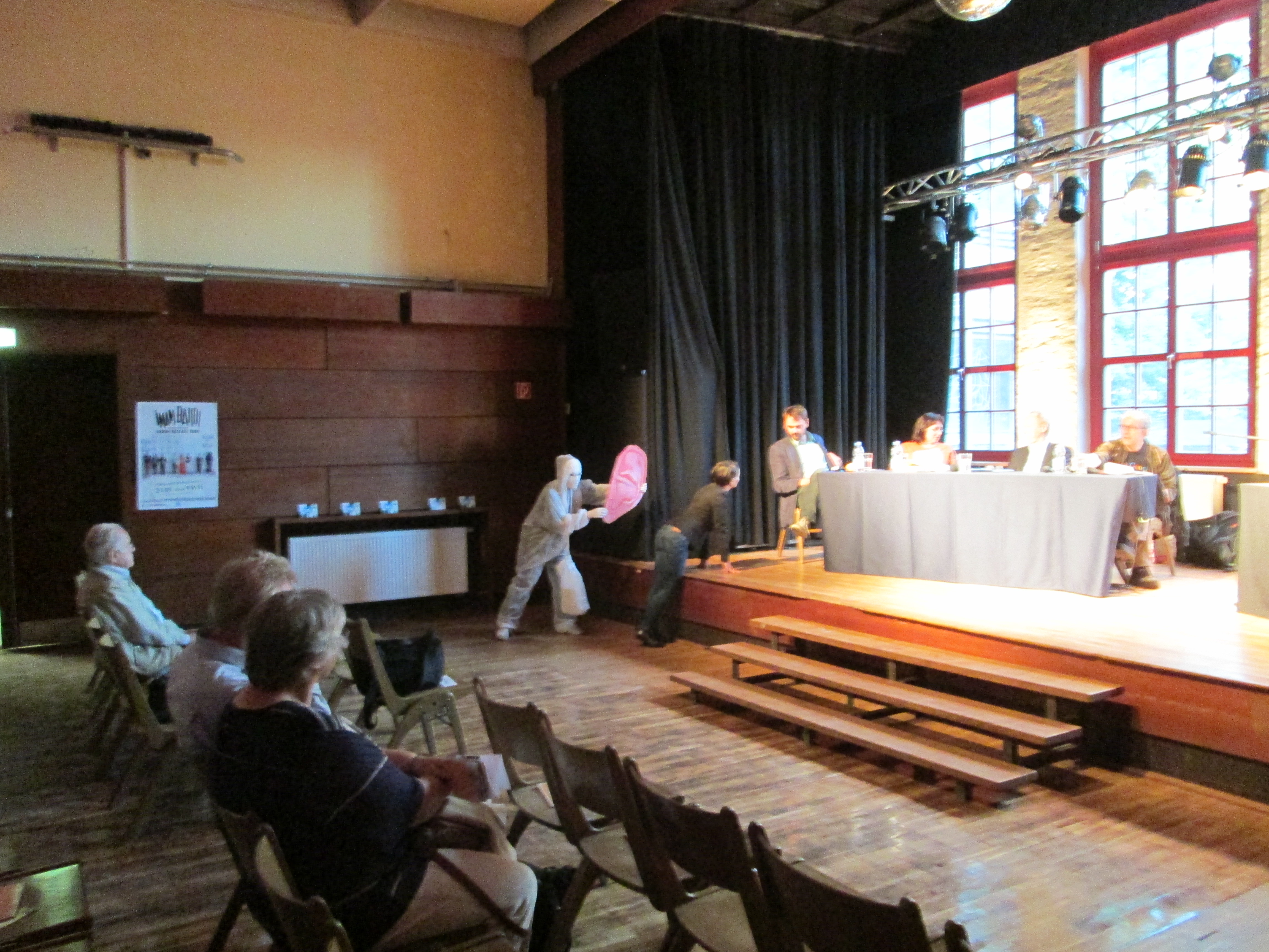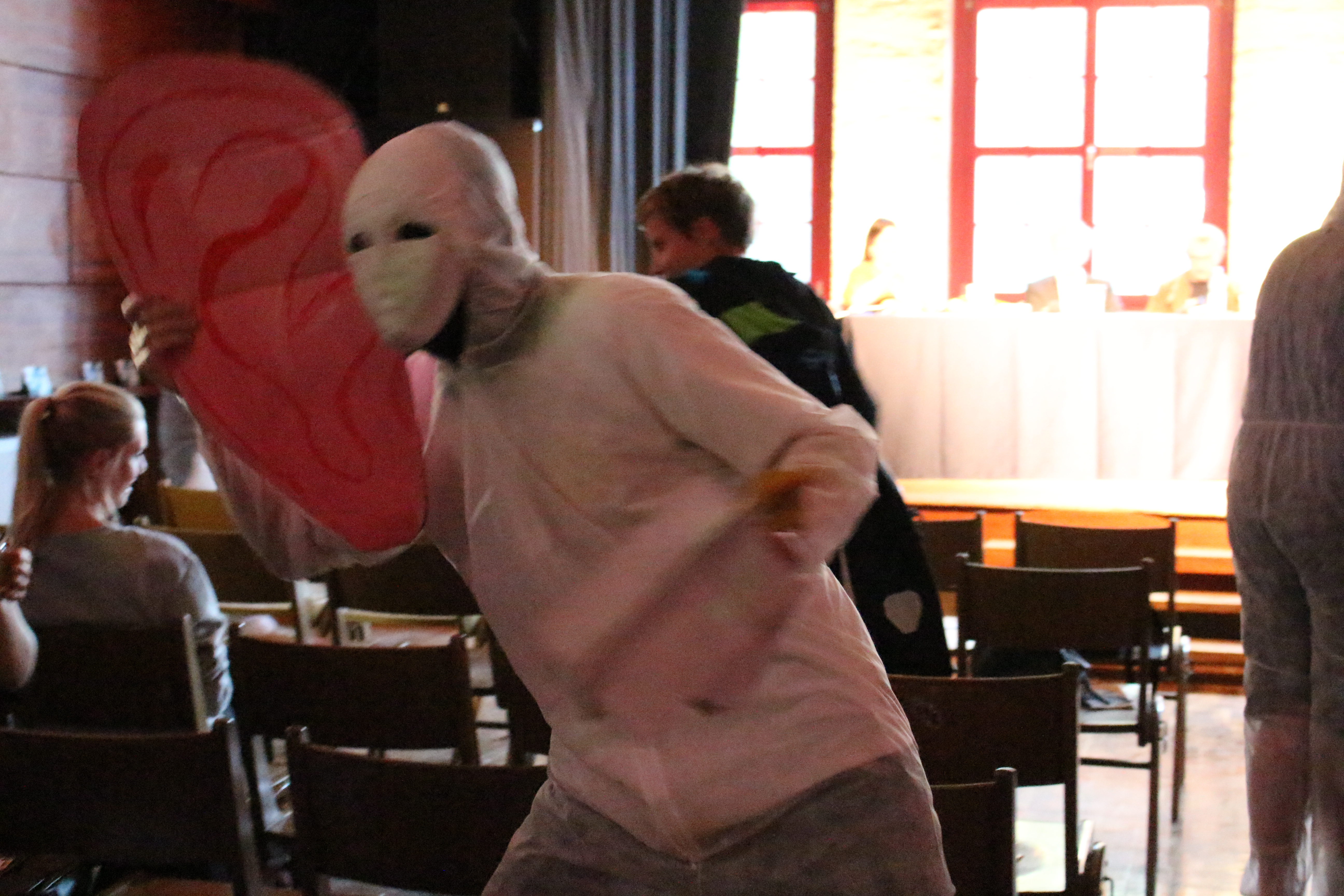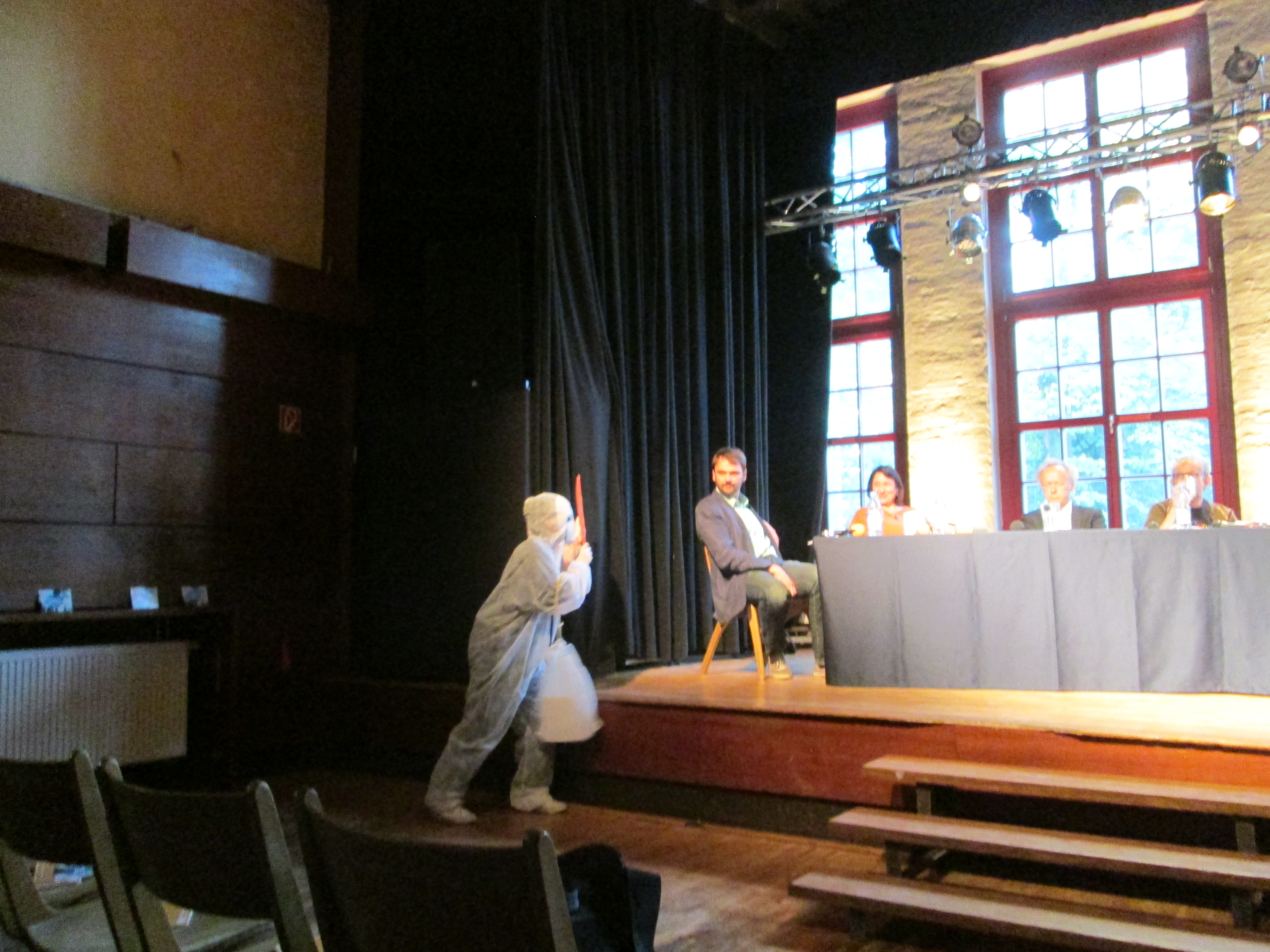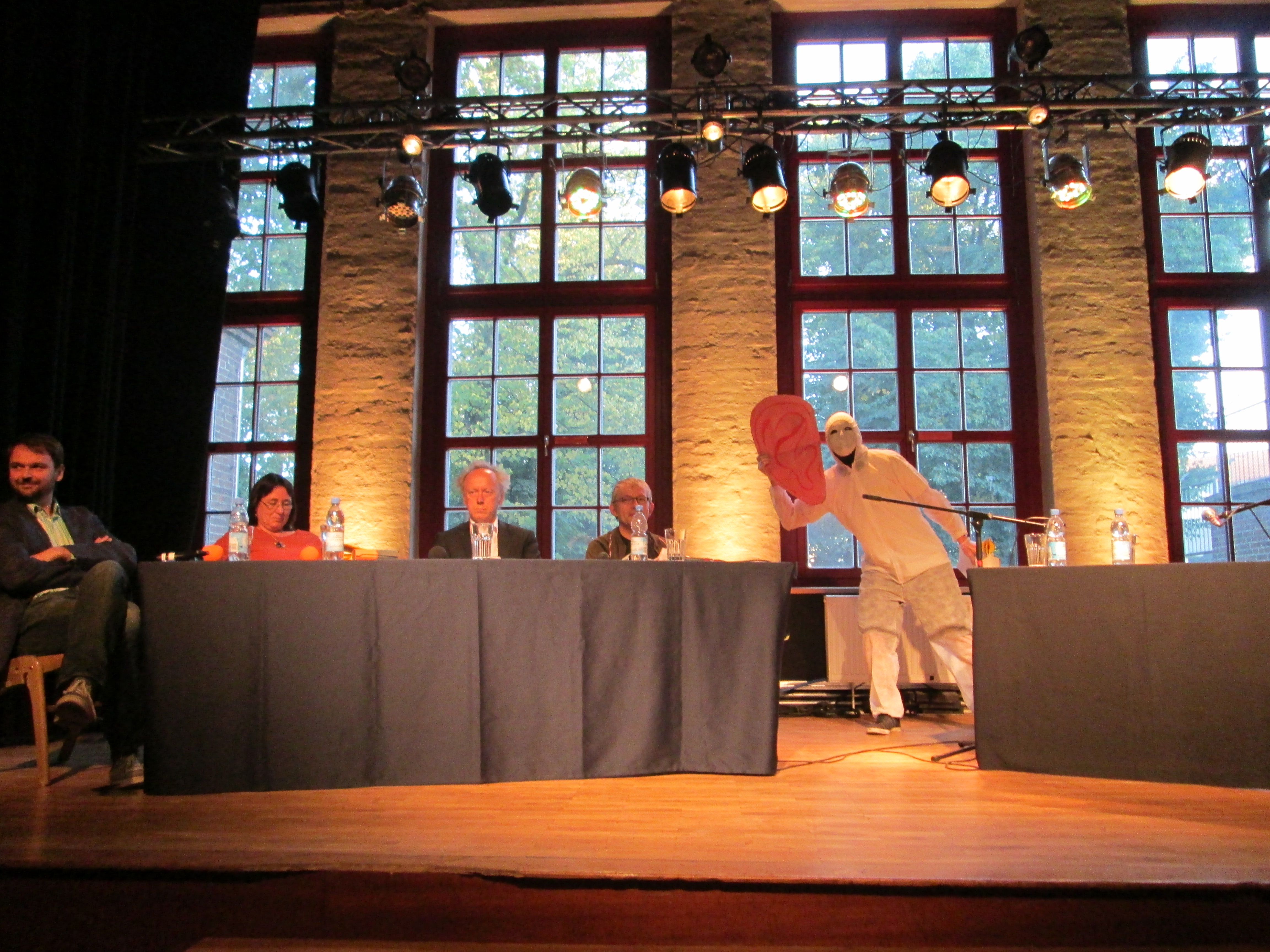 Den Beginn der Lesung begleitete die Gruppe in weisen Anzügen mit weisen Theatermasken als „antropromorphe Personalisierung“ der Überwachung. Mit überdimensionierten Ohren und Augen ausgestattet bespitzelten die als Überwachung in Person gestylten TeilnehmerInnen das Publikum. Außerdem überreichten die Verkleideten den beiden Profs die „Überwachungs-Nebelkerze 2014“ und verteilten entsprechende Ehrenurkunden. Auf diesem erklärte die Theatergruppe auch ihr Anliegen.