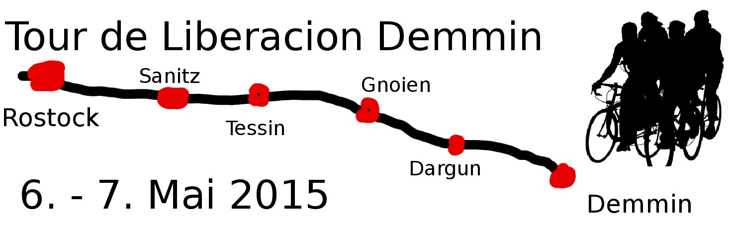 Anreise: Wir möchten am 6.Mai gegen 12:00 Uhr nach einem gemeinsam Frühstück, dass um 10:00 beginnt und auf dem letzte Details der Reise besprochen werden in Rostock starten und mit dem Fahrrad nach Demmin zu dem dortigen Kongress „70 Jahre Befreiung vom Faschismus – wo stehen wir heute“ fahren. Für diejenigen, die es so früh noch nicht schaffen, aber einen Teil der Route mitfahren wollen, besteht die Möglichkeit, mit dem Zug nach Tessin zu fahren und dort ab 16: 40 zu der Fahrradtour dazuzustoßen. Vom 6. auf den 7. Mai wird es eine Übernachtungsmöglichkeit geben, so dass wir am folgenden Tag pünktlich in Demmin ankommen. Entlang der Route möchten wir uns mit Akteuren vor Ort im ländlichen Raum treffen, vernetzen und austauschen.