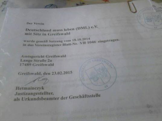 Der Verein Deutschland muss leben wurde am 23.02.2015 offiziell beim Amtsgericht Greifswald eingetragen. Auf Facebook (facebook.com/pages/Deutschland-muss-leben/781428888545877) ist der Verein schon seit Juli 2014 aktiv und bietet nach eigenen Angaben “Hartz4 Beratung, Hilfe bei Kindern, Gefangenhilfe” an. Der Selbstdarstellung zufolge geht es dem DML e.V. darum, ein strömungsübergreifendes, bundesweites Unterstützungsnetzwerk für Neonazis zu etablieren und somit einen Gegenpart zur Roten Hilfe zu schaffen. Neben den offentsichtlichen Strukturen in Mecklenburg-Vorpommern scheint es unter anderem verstärkt Verbindungen zu Aktivisten aus dem Vogtland im speziellen nach Plauen zu geben.