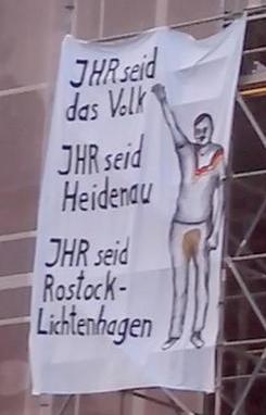 Wir haben am Kulturpalast in Sichtweite der gerade loslaufenden PEGIDA-Demonstration ein Transparent befestigt, welches die Aufschrift: „IHR seid das Volk, IHR seid Heidenau, IHR seid Rostock-Lichtenhagen“ trägt. Daneben abgebildet ist der aus Rostock-Lichtenhagen bekannte Mann, der eingenässte Jogginghosen trägt und den Hitlergruß zeigt.