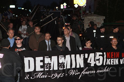 Am 8. Mai sind rund 250 Neonazis durch Demmin gezogen, um die Kapitulation Deutschlands vor 68 Jahren zu betrauern. Mit dabei waren führende NPD-Funktionäre aus Mecklenburg-Vorpommern. Einige Neonazis verkleideten sich als verletzte Veteranen, andere demonstrierten unter den Augen der Polizei ihre Verbundenheit mit der Waffen SS.