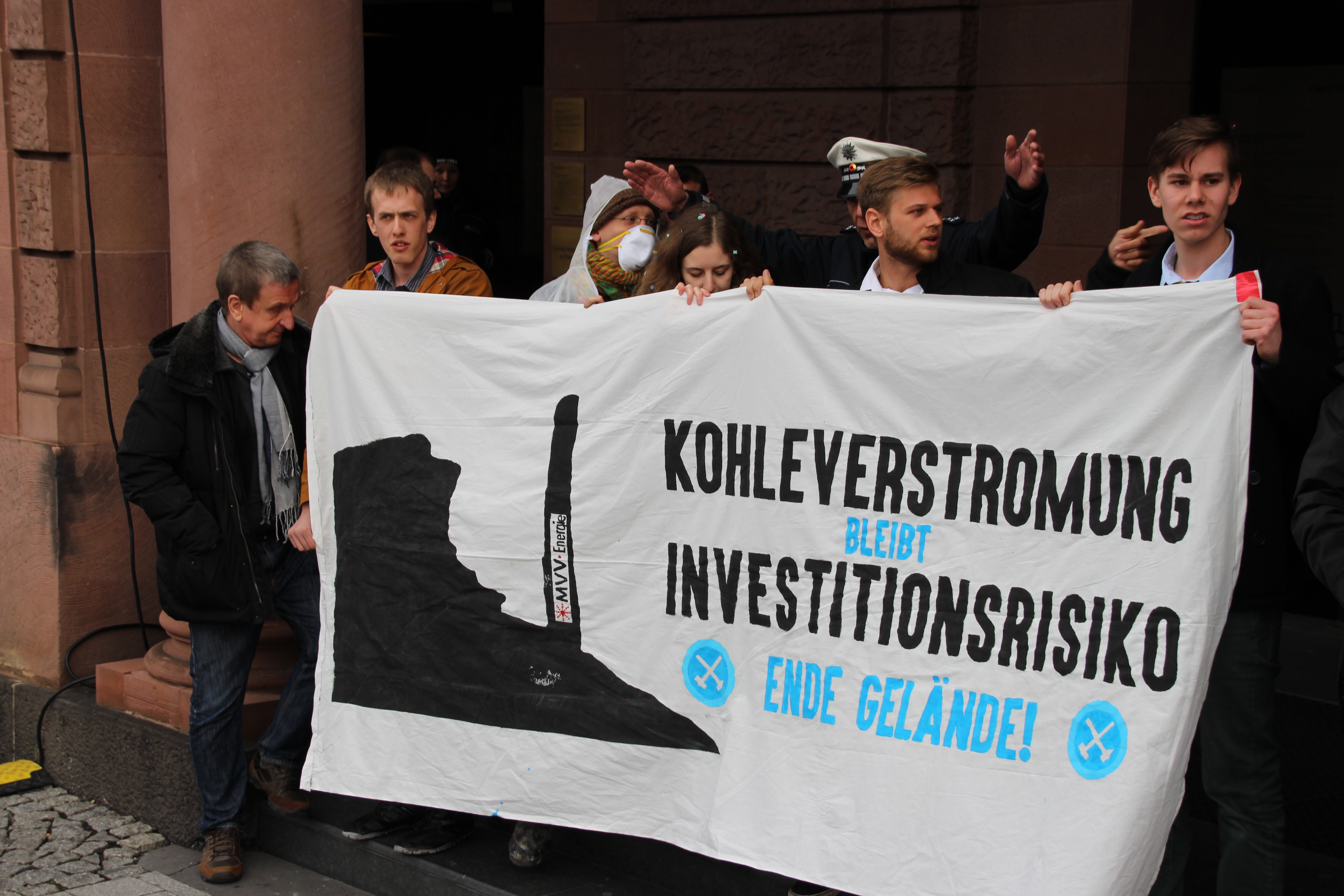 Klimaaktivist_innen der Anti-Kohle-Kampagne “Ende Gelände!” haben am heutigen 4. März 2016 in und vor der MVV-Hauptversammlung im Mannheimer Rosengarten für einen sofortigen Ausstieg der Stadt Mannheim aus der Kohleverstromung demonstriert.