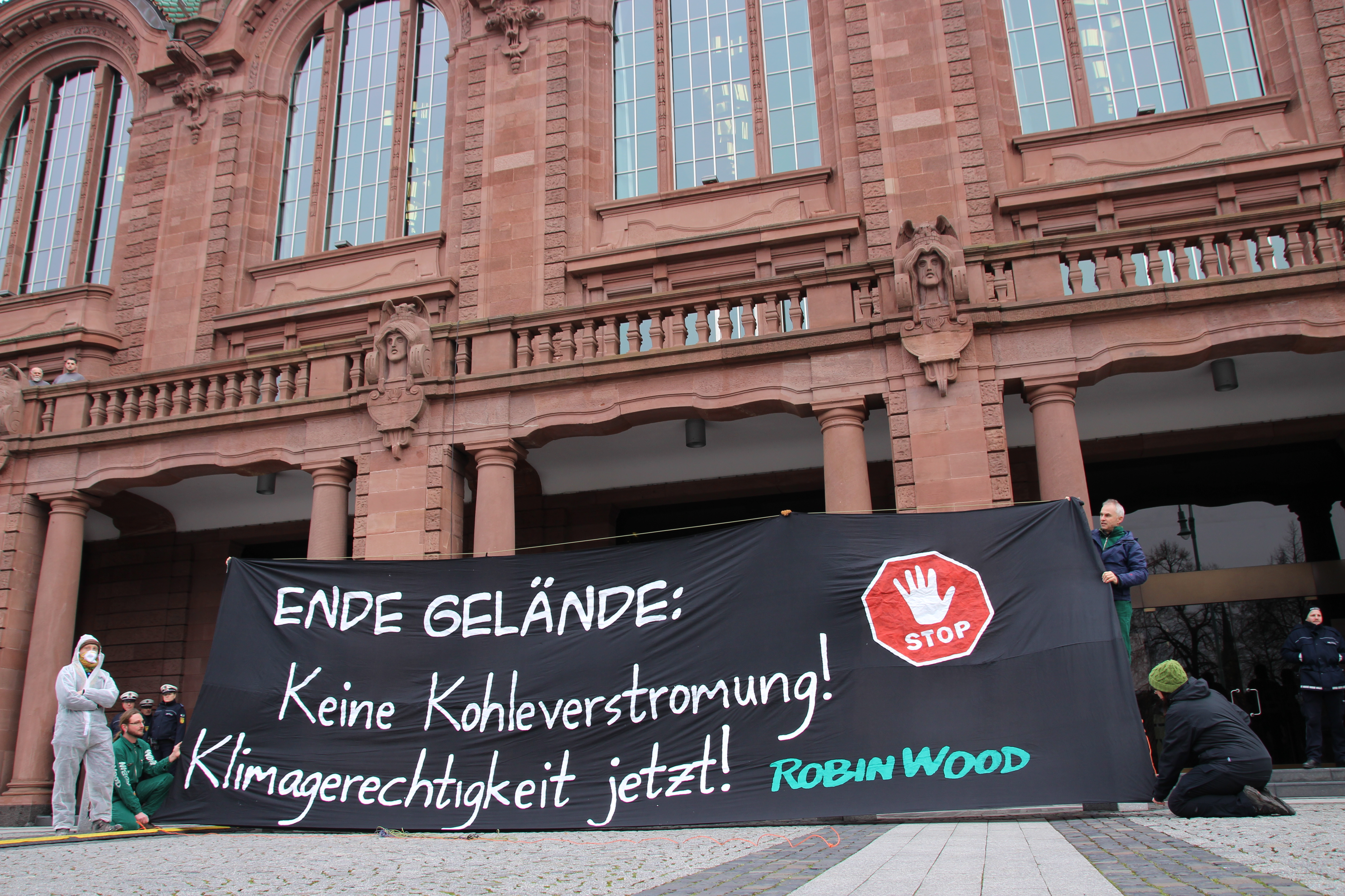 Haupteingang kippte. Aktivist_innen von Robin Wood entrollten ein ca. 10