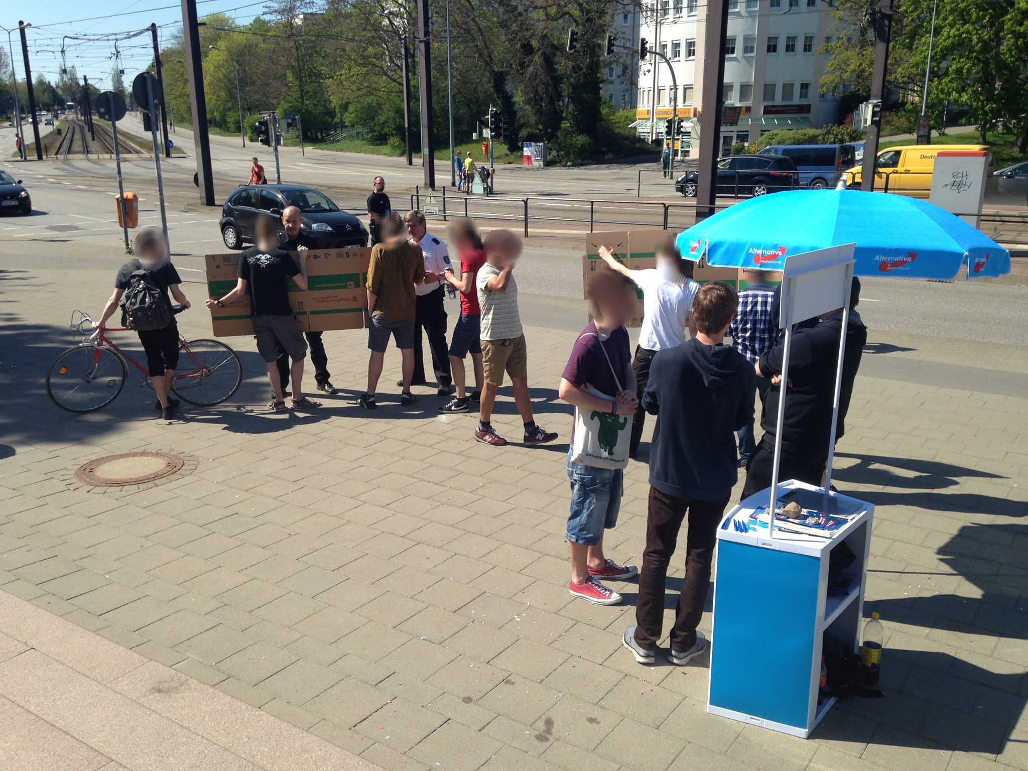 Seit einiger Zeit hat die AFD Ortsgruppe Rostock mit ihrem Vorsitzenden Holger Arppe wieder begonnen Wahlkampfstände in Rostock durchzuführen. Fast Wöchentlich versuchen Sie mit diesen Ständen ihre rassistische Hetze zu verbreiten und Wähler zu Gewinnen. Allerdings nur mit sehr wenig Erfolg, meistens stehen sie Stundenlang mit genervten Gesichtern alleine rum. Zuletzt fanden die Infostände am Neuen Markt, Uni Platz, Marktkauf Lütten Klein und dem Südstadtcenter statt.