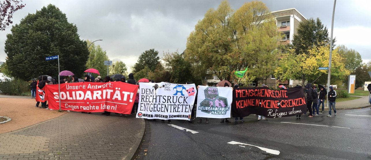 Die Demonstration begann zunächst mit einer Kundgebung auf dem zentralen Platz des Viertels. Zu den Redner_innen der Auftaktkundgebung gehörte neben dem stellvertretenden Neubrandenburger Bürgermeister unter anderem auch die Landtagspräsidenten Sylvia Brettschneider (SPD). Brettschneider scheute sich die Tat als einen rassistische motivierten Mordversuch zu benennen. Stattdessen betonte sie in ihrer Rede gebetsmühlenartig, dass auf den schlimmen Anschlag nun besonnen reagiert werden müsse und das Gewalt hier völlig fehl am Platze sei. Warum in ihrer Rede die Forderung nach gewaltfreier Reaktion auf den Anschlag mehr Raum einnahm, als die Tat selbst oder das Desinteresse der Zivilgesellschaft, der sozialen Initiativen und Vereine, bleibt ihr Geheimnis. Auch an der Demonstration selbst nahm sie mit der Begründung, sie sei gesundheitlich angeschlagen und müsse sich in der kommenden Woche schon im Parlament wieder mit denen Auseinandersetzen, die versuchten unsere Gesellschaft zu spalten, nicht teil. Das Kürzel AfD vermied sie dabei bewusst. Beobachter_innen vermuten, dass Brettschneider nicht unbedingt mit den vorwiegend aus dem Antifa-Spektrum stammenden Demonstrant_innen gesehen werden wollte.