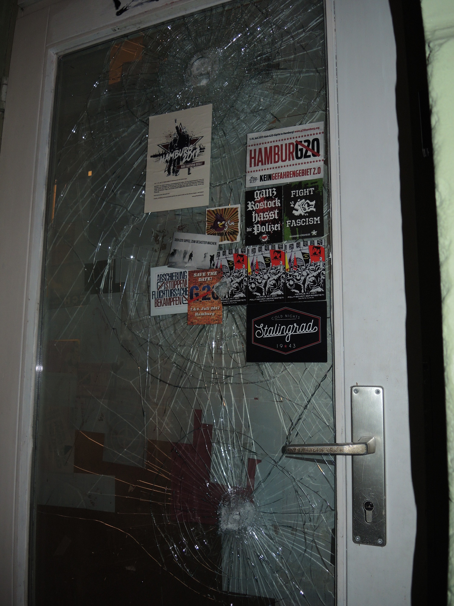 In Rostock hat eine Gruppe Unbekannter am frühen Morgen des 22. Dezembers das Café Median, eine linke Jugendbegegnungsstätte, angegriffen. Gegen drei Uhr versuchten etwa zehn Personen die Glasscheibe der Eingangstür mit einem Hammer einzuschlagen, konnten jedoch nicht ins Innere des Cafés eindringen, teilte der Trägerverein Awiro e.V. am Donnerstag mit. An der Scheibe ist erheblicher Sachschaden entstanden. Das Median befindet sich im Erdgeschoss zweier Projekthäuser, in denen neben einem Wohnprojekt auch Proberäume für Bands und Werkstätten untergebracht sind. Es ist bereits der zweite Vorfall innerhalb weniger Tage vor dem Lokal im alternativ geprägten Stadtteil Kröpeliner-Tor-Vorstadt.