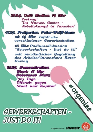 Die organisierenden Gruppen Offemsiv, der Rätekommunistische Arbeiter_innenbund (RAKB, facebook.com/Rätekommunistischer-Arbeiterinnenbund-219115271847206/) und die Basisgewerkschaft Industrial Workers of the World (IWW) entschieden sich bewusst für den zweiten Mai. Zum einen, weil zahlreiche Genoss_innen am 1. Mai die revolutionären Veranstaltungen und antifaschistischen Aktionen in anderen Städten besuchten. Zum anderen, weil der 2. Mai auch der Tag der Arbeitslosen ist, der durch die Demonstration Würdigung erfahren sollte.