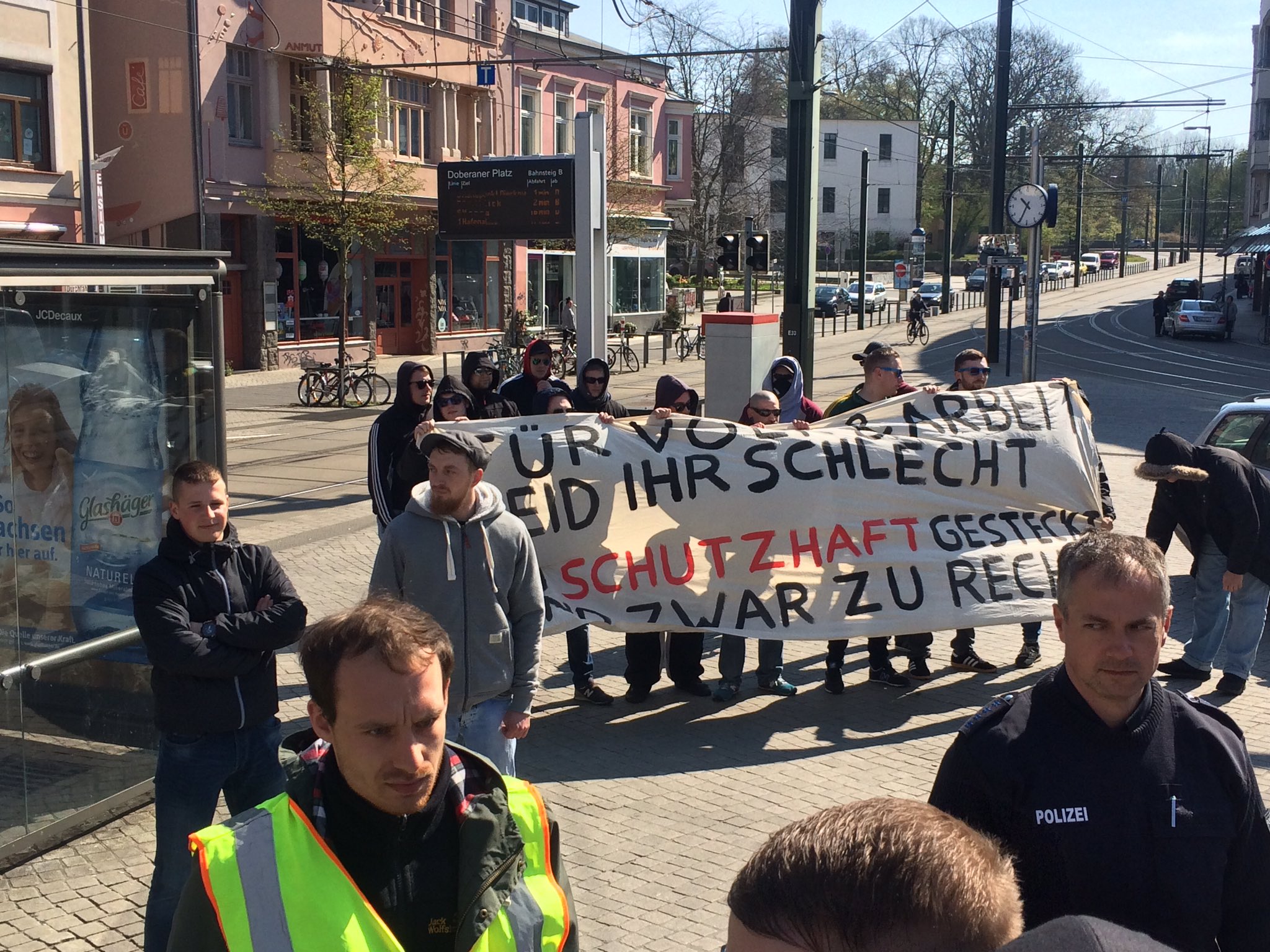 Gegen 17 Uhr sammelten sich etwa 100 Menschen bei schlechten Witterungsbedingungen, um unter dem Motto „365 Tage im Jahr gegen Staat und Kapital!“ zu demonstrieren. Als Auftaktort diente der Doberaner Platz von dem aus bereits am 1. Mai eine Demonstration der DGB Jugend startete. Diese versuchten etwa 15 Neonazis am Montag zu stören, indem sie per Transparent die Inhaftierung von Gewerkschaftern 1933 feierten. Antifas schritten ein und konnten verhindern, dass die Neonazis hinter der Gewerkschaftsdemo herliefen. Dies hatte die Polizei den Rechten zuvor skandalöser Weise angeboten. Nach vehementem Entgegentreten, flohen die Neonazis jedoch in die Straßenbahn. Die Polizei nahm einen Antifaschisten fest.