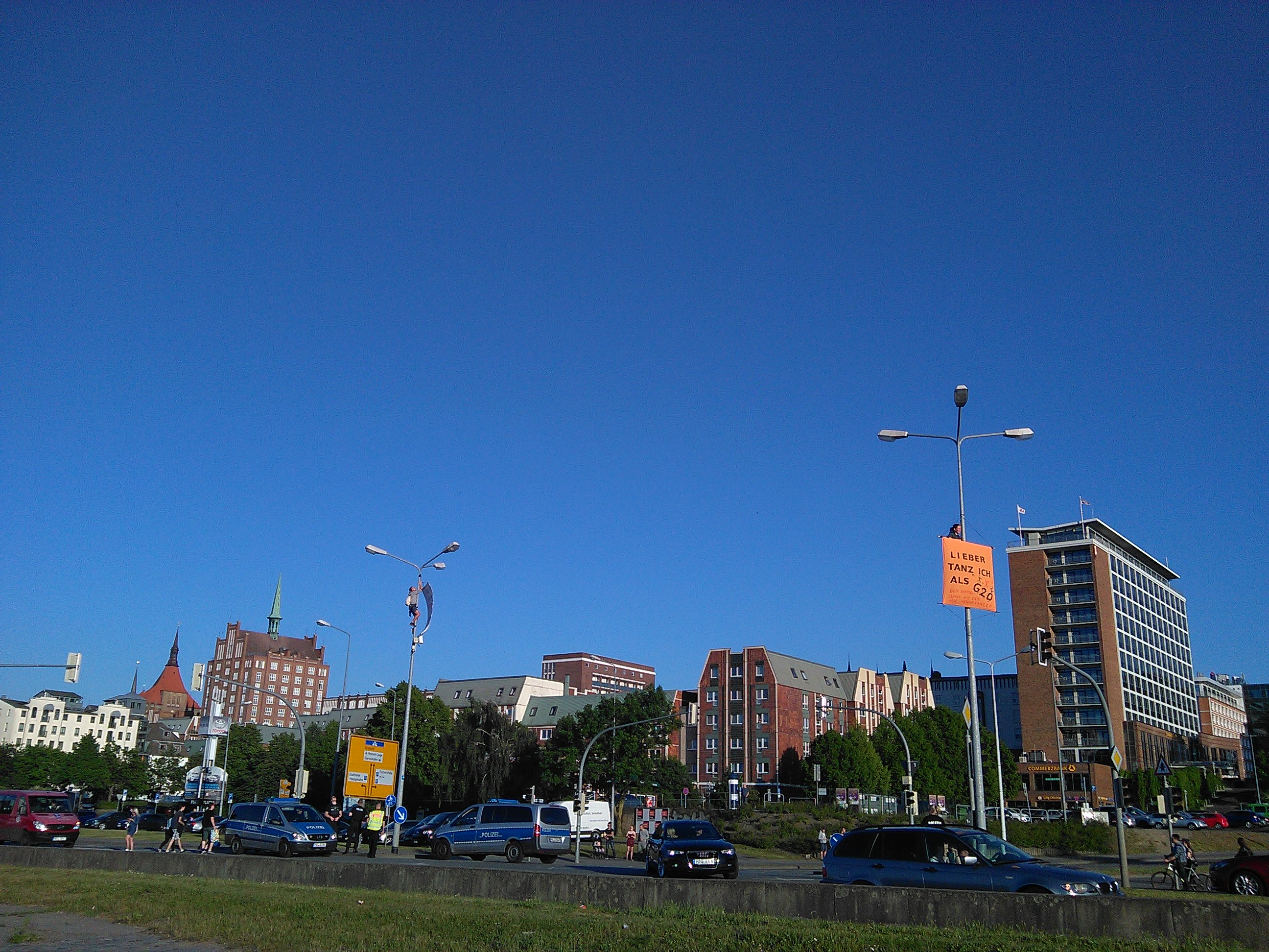 Im Rahmen dieser Demonstration vom Steintor zum Stadthafen erkletterten zwei Anti G20 Aktivist*innen zwei Laternenmasten an der Kreuzung „Warnowufer – Am Kanonsberg“ und befestigten dort Transparente, auf denen zu lesen war „ Im Juli nach Hamburg – G20 Gipfel blockieren“ und „Lieber tanz ich – als G 20“. Mit dieser Aktion wollten die Kletteraktivist*innen auf die in Hamburg stattfindenden Gipfeltage am 7. und 8. Juli aufmerksam machen und Menschen aus Rostock und Umgebung dazu mobilisieren, sich an den Gegenprotesten zu beteiligen.