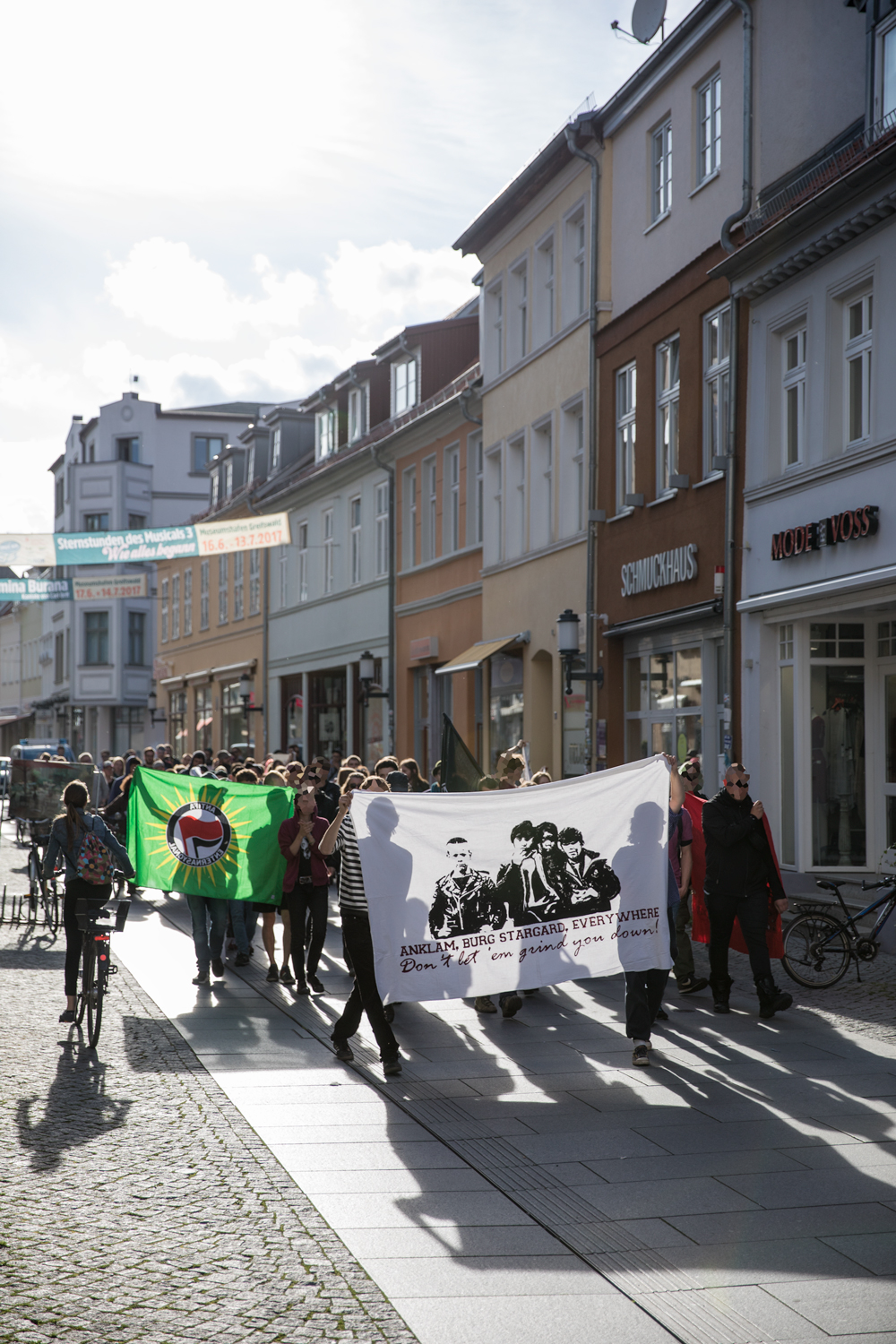 Am 14.06.2017 versammelten sich in Greifswald rund 120 Menschen um ihre Solidarität mit der Burg Stargard und dem Demokratie Bahnhof in Anklam zu demonstrieren.
