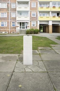 Der fünfte Gedenkort vor dem Sonnenblumenhaus in Rostock Lichtenhagen besteht aus einer zertrümmerten und wieder zusammengesetzten Gehwegplatte und der Stele „Selbstjustiz“ mit einem lose aufgelegten Stein eben jener Platte. Darf bereits bezweifelt werden, dass der Stein dort länger verbleibt, so wird auch die Stele selbst der Erinnerung an das Pogrom in mehrerer Hinsicht nicht gerecht: so präsent möglicherweise die Zertrümmerungsszenen dieser Platten im medialen Gedächtnis sein mögen, waren es doch vor allem Molotovcocktails und die Masse jubelnder Anwohner*innen, die für das Pogrom bezeichnend waren. Auch der Begriff Selbstjustiz bereitet Schwierigkeiten, suggeriert er doch, dass das Pogrom eine Notwehrhandlung gegen eine reale Bedrohung war. Damit werden die Taten von 1992 und das Verhalten der Anwohner*innen im nachinein relativiert und entschuldigt.